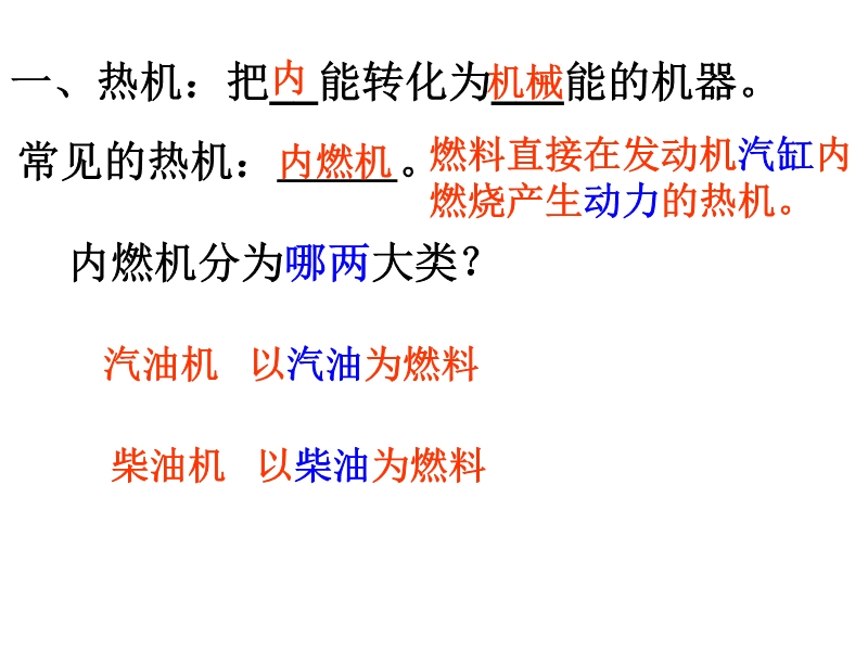 【内容简介】人教版九年级物理全册《14.1热机》PPT+视频+flash,本课件共有13张幻灯片和2个视频。课件通过实验引导学生认识了热机的原理及能量转化情况,课件的重点引导学生认识了内燃机结构及内燃机的工作原理等