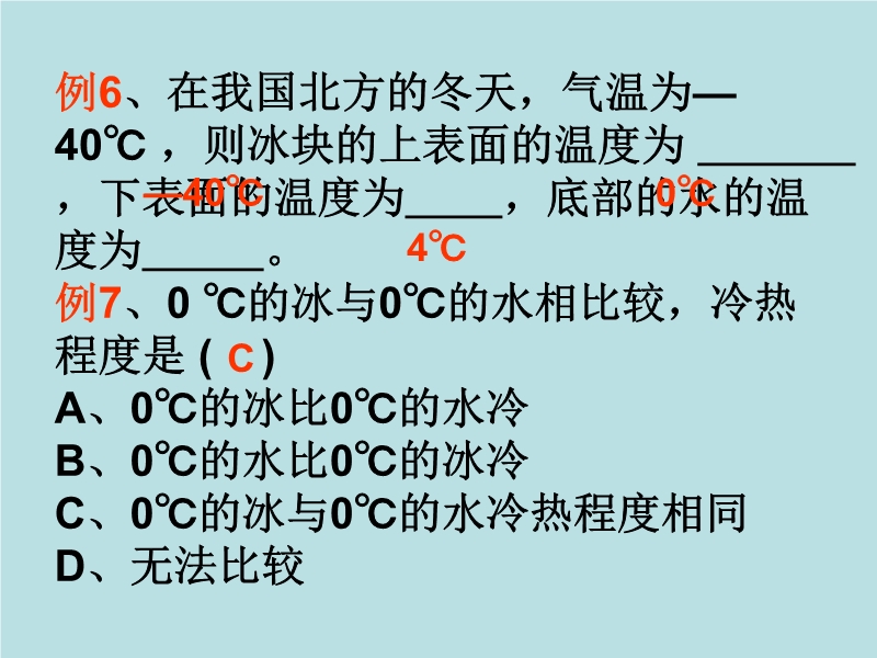 4、在两杯水中都有没熔化的冰块,一杯放在阳光下,一杯放在阴凉处,此时,对两杯水的温度进行比较,判断正确的是——————————————————( )