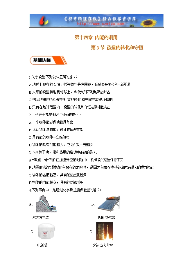 - 2582023-2024人教版九年级物理同步练:《14.3能量的转化和守恒》同步练1(附答案)