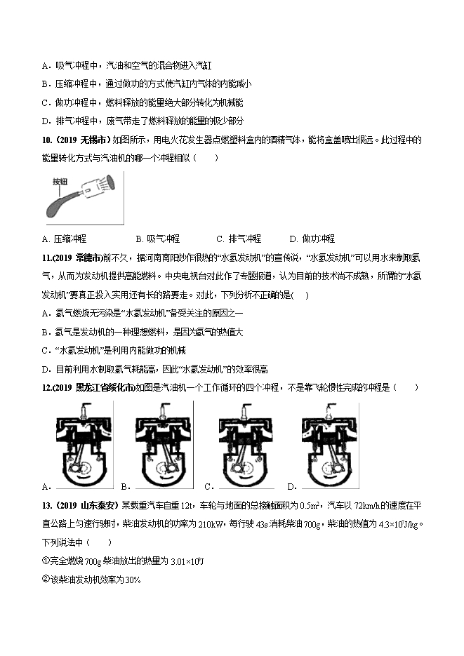 【内容简介】知识要点一:判断汽(柴)油机的冲程,及其能量转化情况。四个冲程的判定方法:根据气门开闭及活塞运动方向判断四个冲程,具体列表如下:冲程进气门排气门活塞的运动方向能量转化开闭向下消耗机械能闭闭向上机械能 内能闭闭向下内能 机械能闭开向上消耗机械能 (2019 天津市)如图是某四冲程汽油机的______冲程,在此冲程中内能转化为______能。 (2019 山东枣庄市)如图所示是内燃机工作循环中的一个冲程,它是( )A.压缩冲程,将化学能转化成内能 B.压缩冲程,将机械能转化成内能C.做功冲程,将内能转化成机械能 D.做功冲程,将机械能转化成内能四冲程内燃机工作过程可巧记为:“一门打开,上排下吸气,两门关闭,上压下做功.”其中“门”指进气门和排气门,“上”“下”指活塞的运动方向.知识要点二:热机的效率和热效率(炉子等)的计算。1.热机效率公式:; 2.(炉子)热效率计算公式: ( 2019孝感)一辆厢式小货车某次运货,满载后总质量是5.0×103kg,在平直的公路上匀速行驶100km,耗油10kg,货车受到的阻力是总重力的0.05倍,发动机的牵引功率是50kW(油的热值是5.0×107J/kg,g=10N/kg),求:(1)货年受到的牵引力;(2)货车匀速行驶的速度;