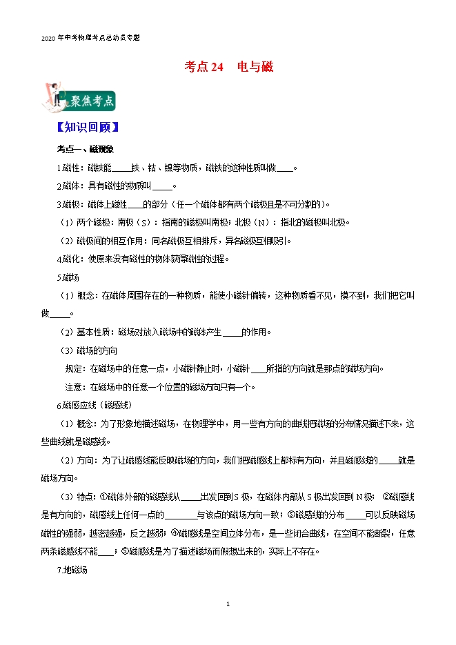 - 12132020年中考物理考点总动员专题:考点24 电与磁(解析版和原卷版)