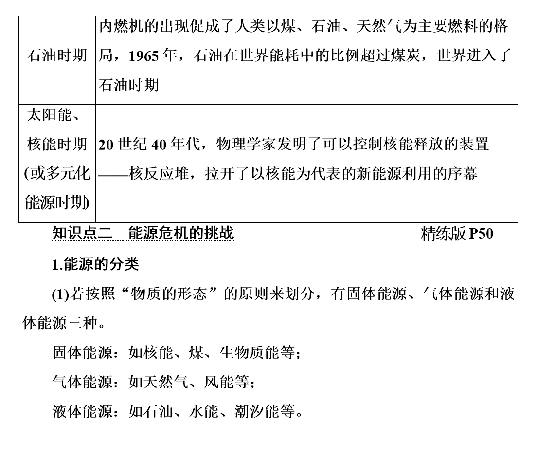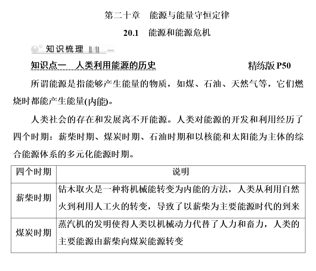 【内容简介】类型一 能源与环境命题点:(1)凡是能够为人类提供生活、生产所需能量的物质资源都叫能源;(2)能源分类的原则。例1 6月5日是世界环境日,低碳排放,保护地球是当今世界的主题,如何合理利用和开发能源,提高能源的利用率,实现低碳减排,已成为世界各国共同关注的问题。(1)在能源家族中,风能、太阳能、水能都同属于________(选填“可再生”或“不可再生”)能源,它们的开发和利用可以减少大量化石能源的生产和消耗所导致的生态破坏与严重环境污染。(2)为实现减排目标,国家大力推广风力、水力发电。如图是我国西部某处风力发电场的壮观画面。假如装机总功率为4.2×106kW的风力场项目全面建成后,所有机组发电1h,可提供多少kW•h电能?若这些电能全部转化为水的内能,那么可以把多少质量的水从28℃加热至沸腾(在标准大气压下)?[水的比热容为4.2×103J/(kg•℃)]解析:本题考查新能源的开发利用。(1)风能、太阳能、水能都可以源源不断地从自然界得到补充,是可再生能源;(2)根据公式W=Pt和Q吸=cm(t-t0)解题。答案:(1)可再生 (2)提供的电能:W=Pt=4.2×106kW×1h=4.2×106kW•h=1.512×1013J,Q吸=W=1.512×1013J,由Q吸=cm(t-t0)得:m=Q吸c(t-t0)=1.512×1013J4.2×103J(kg•℃)×(100℃-28℃)=5×107kg。类型二 关于太阳能的利用命题点:(1)太阳能既属于一次能源又属于可再生能源,还是清洁、无污染的新能源。太阳向外辐射的能量来自于其内部进行的热核反应(核聚变)。太阳能是人类的“能源之母”,除地热能、潮汐能和核能外,大部分能源如风能、水能、生物质能、化石能源都来自太阳能。(2)人类直接利用太阳能的途径主要有三种方式:光热转换、光电转换和光化转换。例2 如图所示的是利用太阳能的三种方式:请你在空白方框内填上相关的科学术语。解析:目前人类直接利用太阳能的方式主要有两种:一是通过光热转换装置把太阳能转化为内能,如太阳灶、太阳能热水器等。另一种是太阳能电池把太阳能转化为电能,如硅光电池等。而间接利用太阳能的“光化转换”是通过植物的光合作用将太阳能储存起来,再以草木、沼气、煤、石油、天然气等燃料的形式释放出来。......
