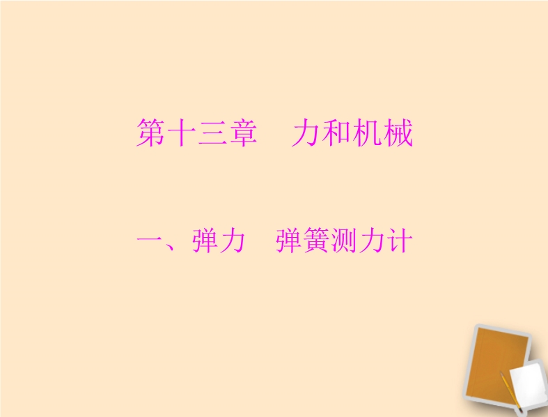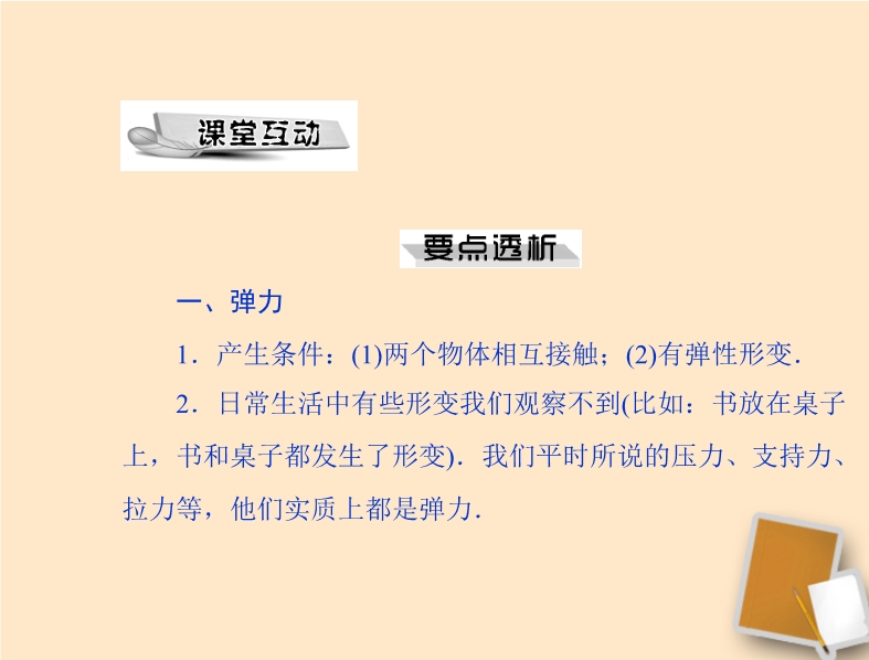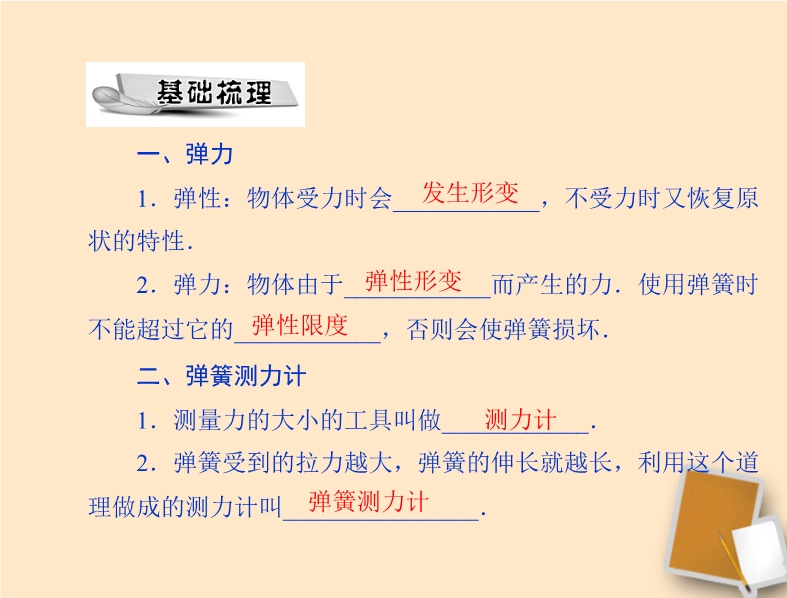 【内容简介】一、弹力1.弹性形变:受力时发生形变,不受力时,又 恢复到原来的形状的性质。2.塑性形变:形变后不能恢复到原来的形状的性质。3.物体由于发生弹性形变而产生的力叫做弹力。4.弹力产生条件:二、力的测量-弹簧测力计1.原理:在弹性限度内,弹簧受到的拉力越大,弹簧的伸长量就越长。2.认清弹簧测力计的量程和分度值。不要超过量程。 3.使用方法:(1)观察量程和分度值。(2)调零。(3)所测力的方向和弹簧轴线方向在一条直线上,弹簧不要靠在刻度盘上。(4)使用时拉动几下,防止指针卡住。(5)弹簧测力计的示数是作用在挂钩一端拉力的大小。