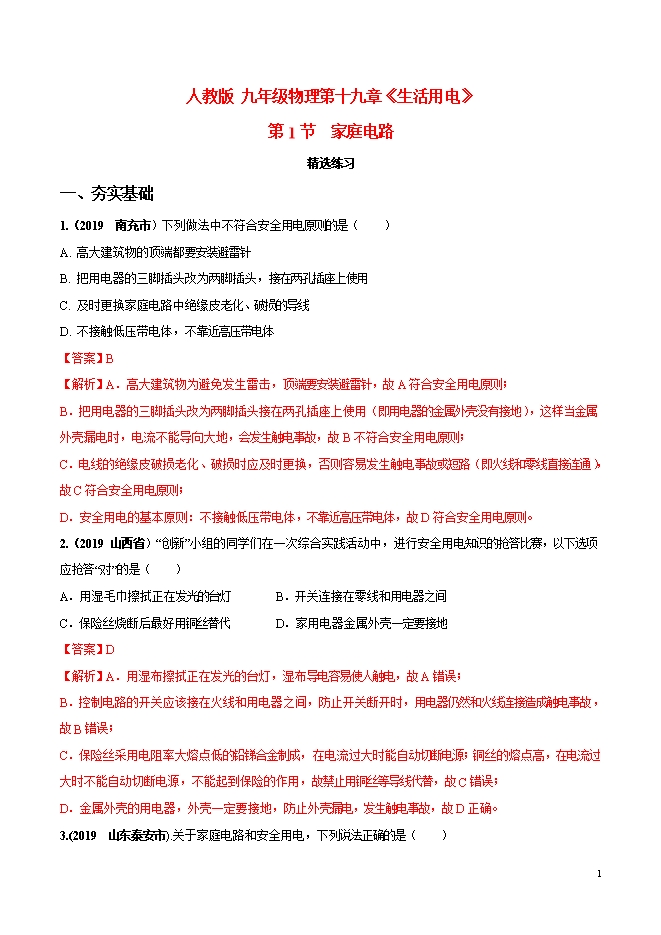 【内容简介】一.填空题(共10小题,每空1分,满分24分)1.(2分)在探索物理的过程中,同学们学习了很多物理定律,请你写出一个你最熟悉的定律及总结这个定律的科学家的名字,例如:牛顿第一定律﹣牛顿,________,________。【答案】欧姆;欧姆定律。【解析】欧姆通过实验得出欧姆定律;焦耳通过实验得出焦耳定律;爱因斯坦是20世纪杰出的物理学家和现代物理学奠基人;牛顿在前人的基础上总结出运动三大定律;伽利略被称之为实验物理学的先驱;哥白尼建立了日心说等。2.(2分)如图所示,两个完全相同的容器,放置在水平桌面上,容器内盛有质量相同,深度相同的不同液体,则液体对容器底压强pa________pb,液体对容器底的压力Fa________Fb.(均选填“>”、“=”或“<”) 【答案】>;<。【解析】(1)由题意可知,两容器内液体的质量m相同,液体深度h相同,由图可知,容器a内液体的体积较小,由ρ= 可知,两液体的密度关系为ρa>ρb,则由p=ρgh可知,液体对容器底压强pa>pb;(2)由p=ρgh和F=pS可得,液体对容器底部的压力:F=pS=ρghS因a容器内液体的体积Va>Sah,b容器内液体的体积Vb<Sbh,所以,Fa=ρaghSa<ρagVa=mag=mg,Fb=ρbghSb>ρbgVb=mbg=mg,则Fa<Fb。3.(3分)大气压与生活密切相关,驻守青藏高原的战士用普通锅煮不熟饭,是因为高原上的大气压较低,导致水的沸点________(选填“降低”、“不变”或“升高”)的缘故。某同学在青藏高原做“托里拆利实验”,液面稳定后的现象如图所示,当时测量的大气压为________mmHg,说明气压随高度的增加而________(选填“增大”“减小”或“不变”)。 【答案】降低;580;减小。【解析】(1)气压越小沸点越低,1标准大气压下,水的沸点是100℃,高原上,由于海拔较高,大气压小于1标准大气压,水的沸点小于100℃,所以高原上用普通锅煮不熟饭;(2)在托里折利实验中,玻璃管内外液面的高度差反映了大气压的大小,读图可知,此时青藏高原的大气压的值为580mm高水银柱,而标准大气压为760mmHg,所以说明气压随高度的增加而减小。4.(2分)如图所示,在水平桌面上粗细相同甲、乙两把水壶,其中甲壶壶身略高,乙壶壶嘴略高,其中能装更多的水的水壶是________(选填“甲”“乙”或“甲乙一样多”),其中原因可以用________原理解释。 【答案】乙;连通器。【解析】水壶的壶嘴与壶身构成连通器,连通器中的同种液体不流动时,各容器中的液面总是相平的;由于两把壶的粗细相同、乙壶的壶嘴略高,所以乙壶能装的水较多。5.(2分)水母身体内有一种特别的腺,腺能产生一氧化碳改变自身体积,从而能在水中上浮与下沉,如图所示,水母悬浮时,若体积变大时则会________;水母在下沉过程中受到水的压强________。 【答案】上浮;变大。【解析】水母悬浮时,浮力等于其重力;若体积变大时,其排开水的体积变大,根据F浮=ρgV排知,浮力变大,浮力大于重力,则水母会上浮;水母在下沉过程中,深度增大,根据p=ρgh知,受到水的压强变大。6.(2分)一天,在某高铁站台上发生了一起乘客摔伤事故。安保人员调查询问时,一位知情者说:“该乘客在站台上候车时,一列动车快速驶过,高速气流把乘客推向远离列车的方向”。请你判断这位知情者________(选填“有”或“没有”)说谎,你判断的依据是________。【答案】有;流体流速越大的位置压强越小。【解析】动车驶过时,流体流速越大的位置压强越小,因此附近气压会低于乘客身体外侧气压,大气压力会把人推向火车,容易发生事故,而不是把乘客推向远离列车的方向,所以这位知情者在说谎。7.(2分)“粘”字常用来表述一些物理现象,例如:吸盘式挂衣钩能够“粘”在墙上是由于________的作用;胶水可以把纸张粘在一起,这是因为________。【答案】大气压;分子间有引力。【解析】把吸盘紧压在光滑的墙上,把吸盘内的空气排出,大气压就把吸盘紧压在了墙上,在钩上可以挂衣服,利用了大气压,胶水凝固以后变为固体,分子间的作用力变得更强,分子间的引力将两张纸粘合在一起。8.(3分)如图所示,把两支完全相同的密度计分别放在甲、乙两种液体中,它们所受到的浮力分别为F甲和F乙,则F甲________F乙;甲、乙两种液体的密度分别为ρ甲和ρ乙,则ρ甲________ρ乙,若两液体深度相同,则两液体对容器底部的压强关p甲________p乙(选填“<”、“=”或“>”)。