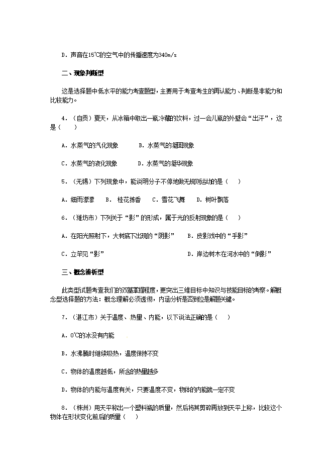 【内容简介】一、单项选择题(本题满分20分,共10小题,每小题2分)每小题给出的四个选项中,只有1个选项符合题目要求。1.琴声悠扬,歌声嘹亮……我们的世界充满声音。下列说法正确的是( )A. 用手拨动琴弦发声,是因为琴弦在振动B. 高声唱国歌,其中“高”指的是音调高C. “闻其声而识其人”,是根据响度来辨别的D. 太空中的宇航员相互交谈,是通过真空传播声音【答案】A【解析】【详解】A.声音的产生是由于物体的振动,琴弦发声,是因为琴弦在振动,A正确;B.高声唱国歌,意思就是大声唱国歌,其中“高”指的是响度大,而不是音调高,B错误;C.音色与发声体的材料有关,材料不同,音色不同,因此“闻其声而识其人”,是根据音色来辨别的,C错误;D.真空不能传声,太空中的宇航员相互交谈,需要利用电磁波传递信息,D错误。故选A。2.我国有着灿烂的诗词文化,很多诗词中蕴含着物理知识。下列说法正确的是( )A. “池水映明月”,水中有明月是光的折射现象B. “潭清疑水浅”,水变浅是光的直线传播现象C. “日影化为虹”,彩虹的形成是光的色散现象D. “起舞弄清影”,影子的形成是光的反射现象【答案】C【解析】【详解】A.“池水映明月”,水中有明月是属于平面镜成像,其原理是光的反射,故A错误;B.“潭清疑水浅”,水变浅是光在不同的介质中发生了折射,属于折射现象,故B错误;C.“日影化为虹”,彩虹的形成是光的色散现象,其原理是光的折射,故C正确;D.“起舞弄清影”,影子的形成是光在同种均匀介质中沿直线传播造成的,故D错误。故选C。3.在新冠肺炎疫情防控中,涉及到很多物理知识。下列说法正确的是( )A. 戴口罩时,眼镜片上出现水雾,这是汽化现象B. 手背上擦酒精时感到凉,是因为酒精升华吸热C. 使用酒精时闻到酒精味,是因为酒精分子在做热运动D. 用冰块给发热病人降温,是利用了冰块的内能比病人的小【答案】C【解析】【详解】A.戴口罩时,眼镜片上的水雾是由空气中气态的水蒸气液化形成的液体小水珠附在上面形成的,故A错误;B.手背上擦酒精时感到凉,是因为液态的酒精汽化变成气态需要吸热,故B错误;C.使用酒精时闻到酒精味,属于扩散现象,是因为酒精分子在做不停息地的无规则运动,也叫分子热运动,故C正确;D.用冰块给发热病人降温,是利用固态的冰块熔化需要吸收热量,从而达到降温的目的,故D错误。故选C。4.关于物质的密度,下列说法正确的是( )A. 一罐氧气用掉部分后,罐内氧气的质量变小,密度不变B. 一只气球受热膨胀后,球内气体的质量不变,密度变大C. 一支粉笔用掉部分后,它的体积变小,密度变小D. 一块冰熔化成水后,它的体积变小,密度变大【答案】D