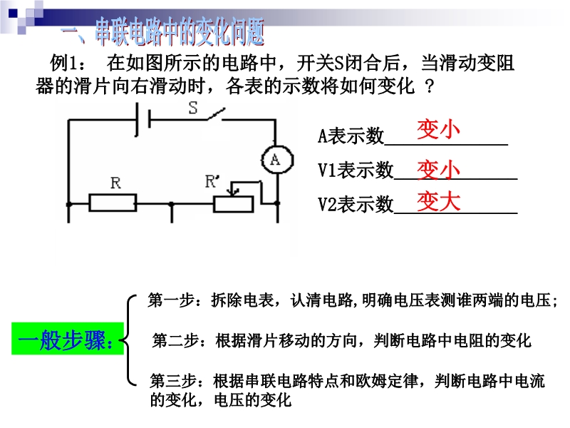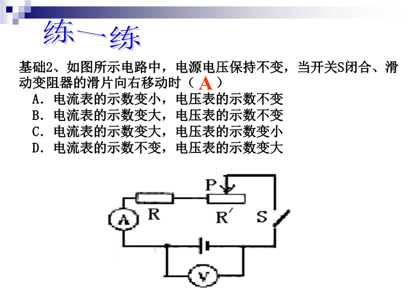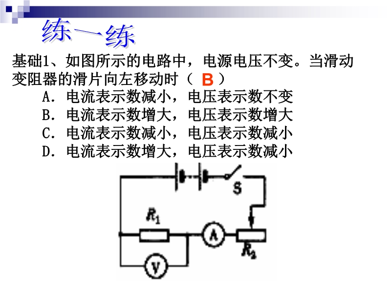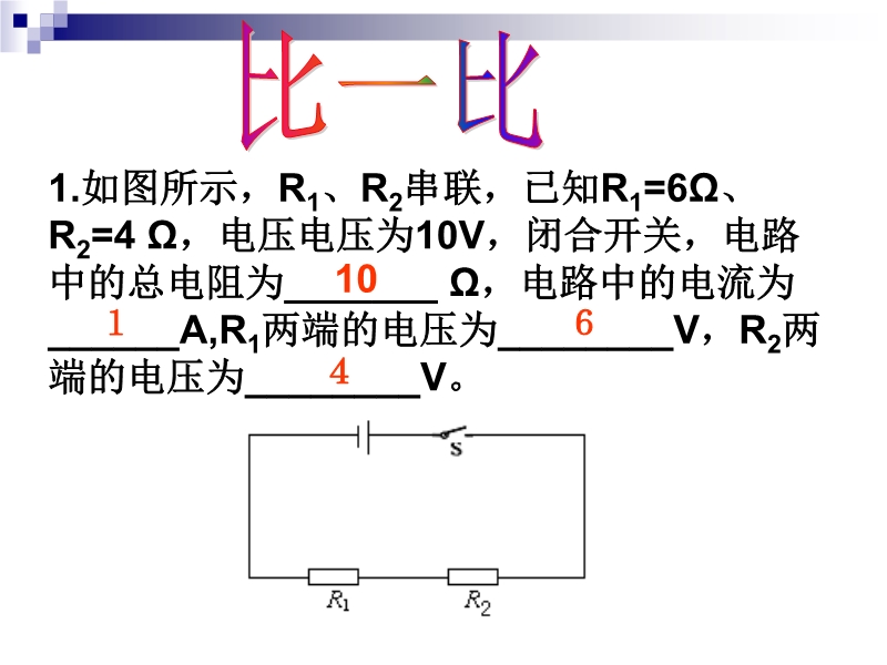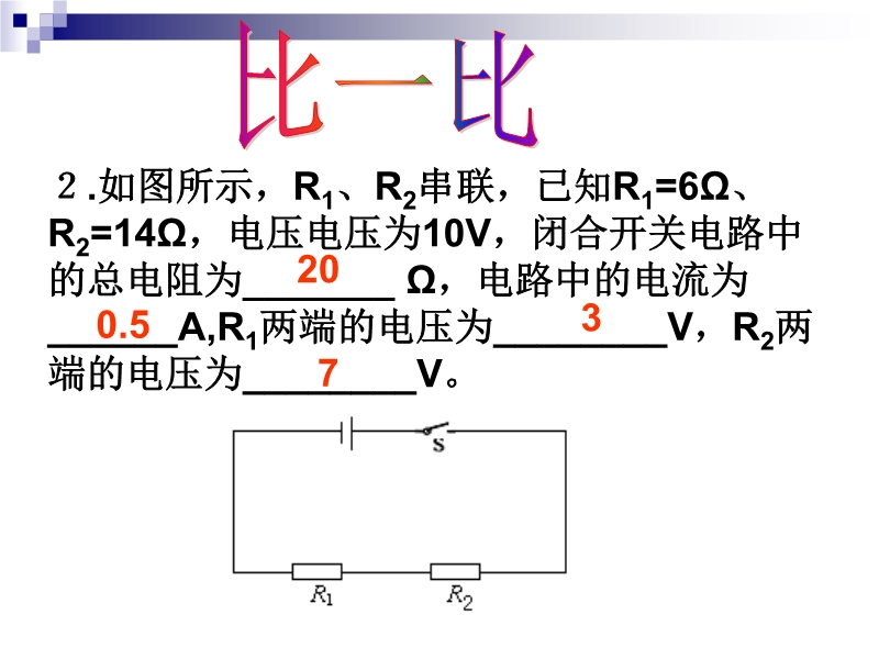 【内容简介】1.(2020广东省).做“探究电流与电阻的关系”实验时,可供选择的器材有:电压为6V 的电源,电流表(0~0.6A),电压表(0~3V),开关,阻值分别为5Ω、10Ω、15Ω 和20Ω的定值电阻各1个,最大阻值分别为10Ω和50Ω的滑动变阻器各1个,导线若干。 (1)如图所示的实验电路中,正确的是______,应选用最大阻值为______Ω的滑动变阻器;(2)若按图乙所示电路图连接好电路后,闭合开关,可观察到电流表的指针______(选填“向右”“反向”或“几乎不”偏转;(3)按正确电路图连接电路,闭合开关,电流表和电压表均有示数,但移动滑动变阻器的滑片时,两表的示数均保持不变,经判断是接线有误,错误可能是______;(4)纠正错误后,依次更换定值电阻,并控制定值电阻两端电压为2.5V进行实验。请将记录实验数据的表格补充完整。① ______V。实验序号1234②______2015105③______【答案】 (1). 甲 (2). 50 (3). 几乎不 (4). 滑动变阻器下面的两个接线柱接入电路 (5). 2.5 (6). (7). 【解析】【详解】(1)[1]探究电流与电阻的关系,电阻、滑动变阻器、电流表串联于电路,电流表测整个电路的电流,电压表测电阻两端的电压;再根据电流表、电压表的接线方法知,实验电路中,正确的是甲。[2]当接入阻值为20Ω的定值电阻时,其两端的电压不能超过3V,根据串联电路分压的特点可得 则变阻器接入电路的最小阻值为 故选应选用最大阻值为50Ω的滑动变阻器。(2)[3]由图乙知,电压表串联接入了电路,因电压表的内阻很大,接入电路时,相当于电路断路,故电流表的指针几乎不动。(3)[4]按正确电路图连接电路,闭合开关,电流表和电压表均有示数,说明电路是通路,两表连接没有问题,但移动滑动变阻器的滑片时,两表的示数均保持不变,说明滑动变阻器以最大值接入了电路,即滑动变阻器下面的两个接线柱接入电路。(4)①[5]探究电流与电阻的关系时,应保持电阻的两端的电压不变,本实验,电阻两端的电压控制在2.5V,故 ②[6]由表格数据知,此格内容应为: 。③[7]因探究的是电流与电阻的关系,为了获得电流与电阻的关系,还应记录每次通过定值电阻的电流值,故表格内容为: 。2.(2019广东省)如图所示,灯泡L1、L2的电阻分别为10Ω、20Ω,闭合开关S,通过L1、L2的电流分别为 、 ,它们两端的电压分别为 、 ,则 A. = , = B. = , = C. = , = D. = , = 【答案】C【解析】【详解】由图可知:灯泡L1、L2串联;根据串联电路的电流特点可知,通过L1、L2的电流相等,即I1:I2=1:1;故BD错误;根据 可得它们两端的电压之比U1:U2=I1R1:I2R2=R1:R2=10Ω:20Ω=1:2,故A错误,C正确。.如图为某兴趣小组设计的电子秤简易电路图,Rx是压敏电阻,阻值随所受压力的增大而减小,R0是定值电阻。测量时,电压表V的示数随所称量物体对压敏电阻的压力增大而增大。请根据以上信息,在虚线框内将电路图补充完整。( )