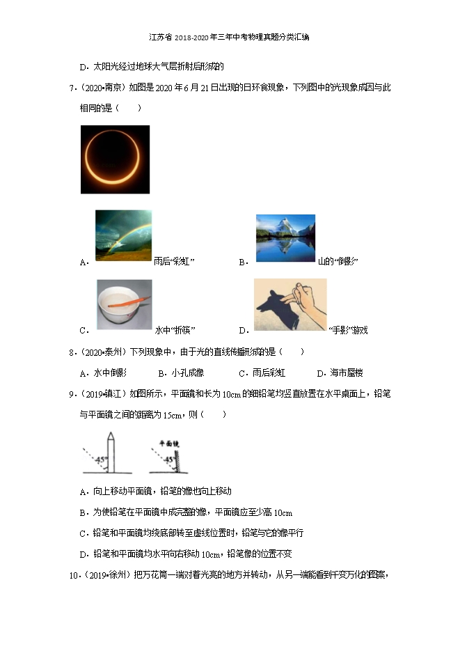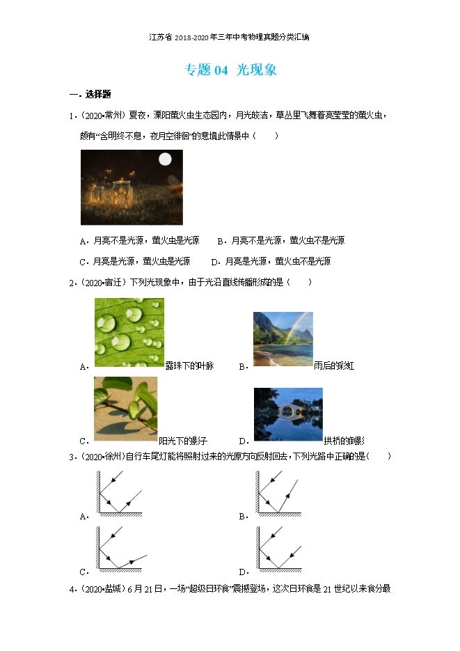 【内容简介】一.选择题1.(2020•徐州)使用蒸汽熨斗时,熨斗内的水变成水蒸气,这种物态变化的名称是( )A.熔化B.凝固C.汽化D.凝华【答案】C【解析】熨斗内的水变成水蒸气,液态水变成气态水蒸气,属于汽化现象。故选:C。2.(2020•常州)如图所示是海波温度随时间变化的图象,已知海波的熔化温度是48℃,则( ) A.海波在AB段处于固态B.海波在BC段既不吸热也不放热C.海波在BC段内能逐渐变小D.海波在CD段吸收热量【答案】C【解析】AB段属于凝固前降温过程,液态,故A项错误;BC段属于凝固段,放热,温度不变,内能减少,故B项错误、C项正确;CD段属于凝固后的降温阶段,固态,故D项错误。故选:C。3.(2020•宿迁)下列现象中,其形成过程属于凝固现象的是( )A.晶莹的露B.坚硬的冰C.缥缈的雾D.雪白的霜【答案】B【解析】A、露是空气中的水蒸气遇冷液化为液态的小水滴,附着在植被表面,故A错误。B、冰是水的凝固现象,故B正确。C、雾是空气中的水蒸气遇冷液化为液态的小水滴,故C错误。D、霜是空气中的水蒸气遇冷凝华为固体的冰晶,附着在建筑物或植被表面,故D错误。故选:B。4.(2020•镇江)下列物态变化中,属于汽化的是( )A. 湿手烘干B. 深秋凝霜C. 清晨结露D. 冰雪消融【答案】A【解析】A、湿手烘干是手上的水汽化为水蒸气,故A正确。B、霜是空气中的水蒸气遇冷凝华为固体的冰晶,附着在建筑物或植被表面,故B错误。C、露是空气中的水蒸气遇冷液化为液态的小水滴,附着在植被表面,故C错误。D、冰雪消融是冰的熔化现象,故D错误。故选:A。5.(2020•盐城)夏天,打开冰箱门会看到一股“白气”,形成该“白气”的物态变化是( )A.液化B.汽化C.升华D.凝华【答案】A【解析】“白气”是空气中的水蒸气遇冷液化放热形成的小水珠。故BCD错误、A正确。故选:A。6.(2020•淮安)如图所示,冬天早晨窗户玻璃内侧常会附着一层冰花,冰花形成过程发生的物态变化是( ) A.汽化B.液化C.升华D.凝华【答案】D【解析】冰花是室内温度较高的水蒸气遇到温度较低的玻璃凝华形成的小冰晶,故ABC错误,D正确。故选:D。7.(2020•南京)下列现象中,物态变化相同的一组是( ) A.①③B.①④C.②③D.②④【答案】C【解析】①冰袋降温,是利用冰熔化吸热。②冰冻的衣服晾干,是冰的升华现象。③干冰变小,是干冰的升华现象。④冰花的形成,是水蒸气的凝华现象。可见,物态变化相同的是②③,故ABD错误、C正确。故选:C。8.(2020•扬州)夏天可以通过洒水或放置冰块来降低温度。下列说法正确的是( )A.洒水降温是因为水的比热容较大B.洒水降温利用了水蒸发吸热C.冰块熔化时从周围物体吸收温度D.冰块熔化过程中温度和内能都不变【答案】B【解析】AB、夏天温度高时洒水,水蒸发时从周围物体吸收热量,可以降低温度,而不是因为水的比热容大。故A错误、B正确。C、夏天温度高时放置冰块,冰块熔化时从周围物体吸收热量,故C错误。D、冰块熔化过程中吸收热量,内能增加,但温度不变,故D错误。故选:B。