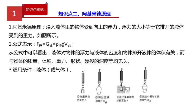 【内容简介】★知识点一:浮力1.浮力:一切浸入液体(气体)的物体都受到液体(气体)对它竖直向上的力叫浮力。2.浮力方向:竖直向上,施力物体是液(气)体。3.浮力产生的原因(实质):液(气)体对物体向上的压力大于向下的压力,向上、向下的压力差就是浮力;如图所示。 4.影响浮力大小的因素:通过实验探究发现(控制变量法):浮力的大小跟物体浸在液体中的体积和液体的密度有关。物体浸在液体中的体积越大,液体的密度越大,浮力就越大。★知识点二:阿基米德原理1.阿基米德原理:浸入液体里的物体受到向上的浮力,浮力的大小等于它排开的液体受到的重力。如图所示。 2.公式表示: ;从公式中可以看出:液体对物体的浮力与液体的密度和物体排开液体的体积有关,而与物体的质量、体积、重力、形状、浸没的深度等均无关。3.适用条件:液体(或气体)。★知识点三:物体沉浮的条件★物体沉浮的条件1.前提条件:物体浸没在液体中,且只受浮力和重力。2.示意图:重力与浮力的关系如图所示: 如图所示,(1)当F浮;G时,物体上浮;ρ液;ρ物。当F浮=G时,物体悬浮;ρ液=ρ物。当F浮;G时,物体下沉;ρ液;ρ物。当F浮=G(物体未完全浸没液体)时,物体漂浮;ρ液;ρ物。3. 说明:(1) 密度均匀的物体悬浮(或漂浮)在某液体中,若把物体切成大小不等的两块,则大块、小块都悬浮(或漂浮)。(2)物体漂浮在密度为ρ的液体中,若露出体积为物体总体积的1/3,则物体密度为2/3ρ。(3) 悬浮与漂浮的比较:相同点:F浮=G物;不同点:悬浮时,ρ液=ρ物,V液=V物;漂浮时,ρ液;ρ物,V液;V物。(4)判断物体浮沉(状态)有两种方法:比较F浮与G或比较ρ液与ρ物。(5)物体吊在测力计上,在空中重力为G,浸在密度为ρ的液体中,示数为F,则物体密度为: 。(6)冰或冰中含有木块、蜡块等密度小于水的物体,冰化为水后液面不变;冰中含有铁块、石块等密大于水的物体,冰化为水后液面下降。4.漂浮问题“五规律”:规律一:物体漂浮在液体中,所受的浮力等于它受的重力;规律二:同一物体在不同液体里漂浮,所受浮力相同;规律三:同一物体在不同液体里漂浮,在密度大的液体里浸入的体积小;规律四:漂浮物体浸入液体的体积是它总体积的几分之几,物体密度就是液体密度的几分之几;规律五:将漂浮物体全部浸入液体里,需加的竖直向下的外力,外力等于液体对物体增大的浮力。★浮力的利用1. 轮船(1)工作原理:要使密度大于水的材料制成能够漂浮在水面上的物体必须把它做成空心的,使它能够排开更多的水。排水量:轮船满载时排开水的质量。单位是t,由排水量m 可计算出:排开液体的体积 ;排开液体的重力 ;轮船受到的浮力 ,轮船和货物共重 。2. 潜水艇工作原理:潜水艇的下潜和上浮是靠改变自身重力来实现的。3. 气球和飞艇工作原理:气球是利用空气的浮力升空的。气球里充的是密度小于空气的气体如:氢气、氦气或热空气。为了能定向航行而不随风飘荡,人们把气球发展成为飞艇。4. 密度计原理:利用物体的漂浮条件来进行工作。构造:下面的金属粒能使密度计直立在液体中。刻度:刻度线从上到下,对应的液体密度越来越大(上小下大)。5.计算浮力方法(1)示重差法:就是物体在空气中的重与物体在液体中的重的差值等于浮力。例1:弹簧秤下挂一铁块,静止时弹簧秤的示数是4N,将铁块浸入水中时,弹簧秤的示数为3.5N,这时铁块所受的浮力是 N, = 。解:由题意可知,铁块受到的重力为4N;铁块浸入水中示数是3.5N,铁块所受浮力为: ,假设铁块体积为 。