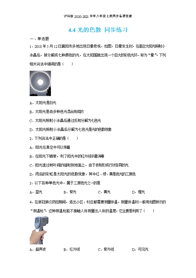 【内容简介】1.一个鸡蛋的质量、物理课本中一张纸的厚度、一块橡皮从课桌上落到地面所用的时间,分别大约是( )A.60g、8mm、0.5sB.10g、80μm、5sC.60g、80μm、0.5sD.10g、8mm、5s2.小明同学用同一把刻度尺对同物体的长度进行了4次测量,结果如下7.34cm、7.36cm、7.37cm、7.85cm,则该物体的长度应记为( )A.7.34cmB.7.35cmC.7.36cmD.7.48cm3.甲、乙两小车同时同地沿同一直线做匀速运动,它们的s﹣t图象分别如图所示。根据图象分析可知( )A.经6秒两车一定相距1.8米B.经12秒两车相距可能为4.8米C.经12秒两车一定相距1.2米D.经6秒两小车可能相距3米4.一个物体做匀速直线运动,前一半路程的速度是6m/s,后一半路程的速度是9m/s,则全程的平均速度是( )A.7.3 m/sB.7.2 m/sC.7.5 m/sD.7.4 m/s5.已知声音在空气中传播的速度为v1,在钢轨中的传播速度为v2,有人用锤子敲了一下钢轨的一端,另一人在另一端听到两次声音的时间间隔为t,下列说法正确的是(v2>v1)( )A.钢轨的长度为 t B.声在这段钢轨中传播的时间为 tC.钢轨的长度为(v2﹣v1)t D.声在这段钢轨中传播的时间为t6.疫情期间停课不停学,同学们在家收看“空中课堂”时,以下有关声音的说法正确的是( )A.不同老师教学时说话声音的音色不同 B.增大音量提高了声音的音调C.关上窗户可以防止外界噪声的产生 D.学生听老师讲课,利用了声音能够传递能量7.用体温计测量病人甲的体温,示数是37.8℃,如果该体温计未经甩过就用来测量病人乙的体温,示数也是37.8℃,下列判断正确的是( )A.乙的体温一定等于甲的体温 B.乙的体温不可能等于甲的体温C.乙的体温不可能高于甲的体温 D.乙的体温一定低于甲的体温8.妈妈从冰箱冷藏室取出一块黄油放进锅里煎牛排,黄油在加热过程中逐渐变软、变稀,然后变成液态。下列图象中能正确反映该过程中黄油的温度随时间变化过程的是( )