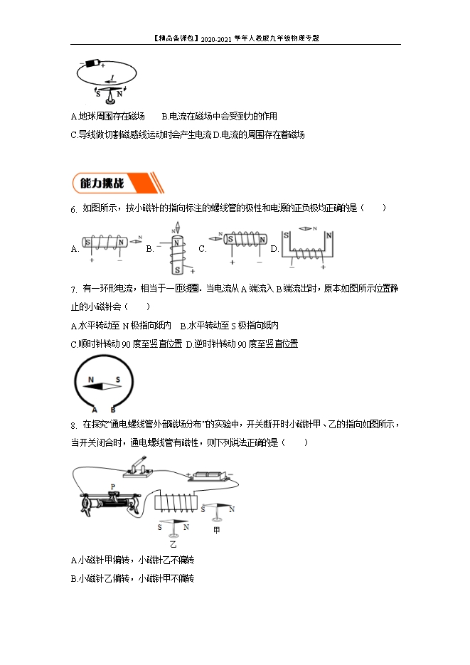 【内容简介】1.(2020•内蒙古呼和浩特市•中考真题)在历史的长河中,有相当长的一段时间里,人们认为电现象和磁现象是互不相关的。直到1820年,丹麦物理学家__________(选填“安培”、“奥斯特”或“法拉第”)发现,电流周围存在磁场,成为世界上第一个发现电与磁联系的科学家。如图是“探究导体在磁场中运动时产生感应电流条件”的实验装置。闭合开关后,导体棒、灵敏电流计、开关、导线组成闭合电路。实验观察到的现象如下表(实验中电流由左进入电流计,指针向左偏,电流由右进入电流计,指针向右偏)。 实验序号磁场方向导体棒ab运动方向灵敏计指针偏转情况1向下向上不偏转2向下不偏转3向左向右偏4向右向左偏5向上向上不偏转6向下不偏转7向左向左偏8向右向右偏(1)实验表明,闭合电路中的部分导体在磁场中做下列哪种运动时,电路中产生感应电流_______。A.平行磁感线运动    B.切割磁感线运动(2)导体中产生的电流方向,与导体的运动方向,以及磁感线的方向都有关系,根据题给信息,分析判断下列方向关系正确的是_______。A. B.  C. 2.(2020•陕西中考真题)如图是科技小组的同学利用电磁转换的知识制作的“电能无线传输”装置的示意图。图中送电线圈利用电流产生磁场,受电线圈利用磁场产生电流。受电线圈正对并靠近送电线圈可以产生电流,使灯泡发光,实现电能的无线传输。 (1)送电线圈是利用电流的____效应工作的,与受电线圈产生电流的原理相同的是______ ;(选填“电动机”或“发电机”)(2)受电线圈中电流大小可以通过灯泡______来反映;(3)在图中的电源、调节装置和送电线圈不改变的情况下,该小组同学想探究影响受电线圈两端电压大小的因素,猜想它可能与受电线圈的匝数、直径及两线圈之间的距离有关。通过查阅资料,他们了解到了受电线圈两端电压与线圈匝数的关系。接着他们用相同规格的漆包线绕制了多个匝数相同、直径不同的线圈,对其余两个猜想进行探究。实验数据如下表:(送电线圈直径为70.0mm)    实验次数受电线圈的直径D/mm两线圈之间的距离d/mm受电线圈两端的电压U/V170.022.08.6270.011.014.1370.05.520.54145.05.510.35105.05.516.9645.05.513.9732.05.55.4①分析______三次实验数据可初步得出结论:在受电线圈的直径和匝数相同时,两线圈之间的距离越小,受电线圈两端的电压越大;②分析3、4、5、6、7五次实验数据可初步得出结论:在两线圈之间的距离和受电线圈的匝数相同的情况下,受电线圈直径增大时,其两端电压______;(4)通过实验,小组同学发现电能无线传输存在传输距离______的缺点尽管如此,电能无线传输技术仍然有着广阔的应用前景,如部分手机和电动牙刷的无线充电3.(2020•山东烟台市•中考真题)如图所示,一个综合实践小组用一段漆包线绕成线圈abcd,用小刀刮两端引线的漆皮,一端全部刮去,另一端只刮上半周或下半周。将线圈abcd放在用硬金属丝做成的支架m、n上,并按图示连接电路,则电磁铁的上端是______极。闭合开关,用手轻推一下线圈,线圈会持续转动,这就是简易的______(选填“发电机”或“电动机”),若只将电源的正负极互换,则线圈转动方向会与原来的转动方向______(选填“相同”或“相反”)。 4.(2020•广西河池市•中考真题)丽丽利用电池、小磁针和导线等器材做了如图所示的实验。 (1)由图甲与乙可知通电导体周围存在______;生活中利用这个原理来工作的是______(选填“电磁铁”或“发电机”);(2)改变电流方向,如图丙所示,小磁针偏转方向与图甲______(选填“相同”或“相反”)。5.(2020•辽宁沈阳市•中考真题)安安在探究通电螺线管的磁场分布的实验中,如图所示: (1)在固定有螺线管的水平硬纸板上均匀地撒满铁屑,通电后轻敲纸板,观察铁屑的排列情况,发现通电螺线管外都的磁场与______磁体的磁场相似;在通电螺线管的两端各放一个小磁针,根据小磁针静止时的指向,可以判定通电螺线管的______(选填“左”或“右”)端是它的N极;(2)如果想探究通电螺线管的极性与电流方向的关系,接下来的操作是______,并观察小磁针的指向。6.(2020•广西贵港市•)为了探究通电螺线管外部磁场的方向,小明设计了如图甲所示实验。
