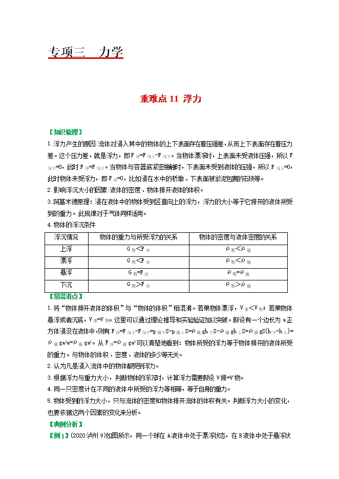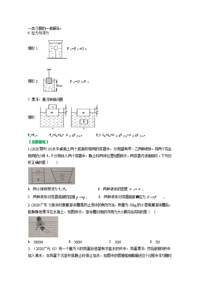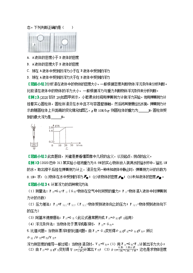 【内容简介】【知识梳理】1.浮力产生的原因:流体对浸入其中的物体的上下表面存在着压强差,从而上下表面存在着压力差。这个压力差,就是浮力,即F浮=F向上-F向下。当物体漂浮时,上表面未受液体压强,所以F向下=0,此时F浮=F向上。当物体与容器底紧密接触时,下表面未受到液体的压强,所以F向上=0,此时物体未受浮力,即F浮=0,比如浸在水中的桥墩、下表面被淤泥包裹的石块等。2.影响浮沉大小的因素:液体的密度、物体排开液体的体积。3.阿基米德原理:浸在液体中的物体受到竖直向上的浮力,浮力的大小等于它排开的液体所受到的重力。此规律对于气体同样适用。4.物体的浮沉条件浮沉情况物体的重力与所受浮力的关系物体的密度与液体密度的关系上浮G物<F浮ρ物<ρ液漂浮G物<F浮ρ物<ρ液悬浮G物=F浮ρ物=ρ液下沉G物>F浮ρ物>ρ液【易混淆点】1.将“物体排开液体的体积”与“物体的体积”相混淆。若果物体漂浮,V排<V物;若果物体悬浮或者沉底,V排=V物。这里可以通过理论推导和实验验证加以突破。假设有一个边长为a正方体浸没在液体中,则有F浮=F向上-F向下=p液下S-p液上S=ρ液gh下S-ρ液gh上S=ρ液gS(h下-h上)= ρ液ga2a=ρ液ga3。从F浮=ρ液ga3可以清楚地看到:物体所受的浮力等于物体排开的液体所受的重力。与物体的体积、密度、液体的多少等无关。2.认为凡是浸入流体中的物体都受到浮力。3.根据浮力与重力大小,判断物体的浮沉时,计算浮力需要假设V排=V物。4.同一只密度计在不同的液体中所受的浮力等相等,等于自身的重力。5.物体受到的浮力大小,只与流体的密度和物体排开流体的体积有关。判断浮力大小的变化,也要依据这两个因素的变化来分析。【典例分析】【例1】(2020泸州9)如图所示,同一个球在A液体中处于漂浮状态,在B液体中处于悬浮状态。下列判断正确的是( ) A. A液体的密度小于B液体的密度B. A液体的密度大于B液体的密度C. 球在A液体中受到的浮力小于在B液体中受到的浮力D. 球在A液体中受到的浮力大于在B液体中受到的浮力【答案】B【分析】A B.因为球在A液体中处于漂浮状态,则有ρA>ρ球,在B液体中处于悬浮状态,则有ρB>ρ球,所以ρA>ρB, A错,B正确。C D.同一个球在A液体中处于漂浮状态,在B液体中处于悬浮状态,所以在两液体中的浮力:F浮=F球,即球在A液体中受到的浮力等于在B液体中受到的浮力,C、D错。选B。【思路小结】分析浸在液体中的物体的密度大小,一般根据密度判断物体浮沉条件来分析判断。比较浸在液体中的物体的浮力大小,一般根据浮力与重力判断物体浮沉条件来分析判断。【例2】(2020甘孜29)如图甲所示,小聪课余时间用弹簧测力计做浮力实验。他用弹簧测力计挂着实心圆柱体,圆柱体浸没在水中且不与容器壁接触,然后将其缓慢拉出水面,弹簧测力计示数随圆柱体上升距离的变化情况如图乙,g取10N/kg,则圆柱体的重力为 N,圆柱体受到的最大浮力是 N。 【答案】 2 0.4【分析】由图象可知:当物体完全露出水面时,弹簧测力计的示数为2N,由二力平衡知识得圆柱体的重力为2N。由图象可知:当圆柱体浸没在水中时,弹簧测力计的示数F′=1.6N,圆柱体受到的最大浮力F浮=G- F′=2N-1.6N=0.4N。【思路小结】此类题目,关键是要看懂图像中几段的含义,以及起点、拐点的含义。【例3】(2020巴中31)某实验小组将重力为8.9N的实心物体放人装满水的溢水杯中,溢出1N的水。取出擦干后挂在弹簧测力计上,浸没在另一种未知液体中静止时,弹簧测力计的示数为8.1N。求:(1)物体在水中受到的浮力 ;(2)该物体的密度 ;(3)未知液体的密度 。【答案】(1)1N (2)8.9×103kg/m3 (3)0.8×103kg/m3【分析】(1)根据阿基米德原理可得物体在水中受到的浮力F浮=G排=1N。