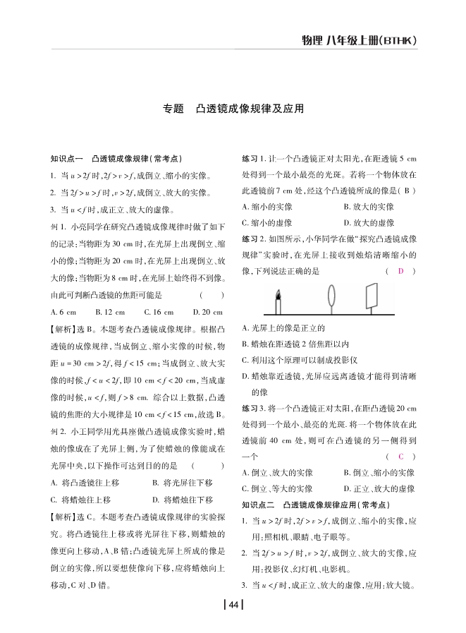【内容简介】【设计与进行实验】1.主要实验器材及作用:(1)光具座(带光具座):便于测量物距和像距;(2)光屏:承接蜡烛的像;(3)凸透镜:对光线有会聚作用,应放在蜡烛和光屏 之间 ;2.实验装置图 3.实验操作及注意事项(1)实验时,先调节蜡烛、透镜和光屏,使烛焰的中心、透镜的光心和光屏的中心大致在同一高度,目的是:使像成在光屏中央.(2)保持凸透镜的位置不变,若将蜡烛逐渐靠近凸透镜(且物距始终大于焦距),则必须将光屏向远离凸透镜的方向移动,才能在光屏上得到清晰的像.(3)实验过程中,蜡烛燃烧变短,为了使像仍成在光屏的中央,如果只调节蜡烛,应把蜡烛往上调;如果只调节光屏,应把光屏往上调.(4)实验过程中,如果有一只小虫子落在透镜上,光屏上的成像情况是:仍然成完整的像,只是像的亮度变暗.(5)实验过程中,光屏上已经出现清晰的烛焰的像,此时若把近视眼镜放在蜡烛和透镜之间,光屏上的像变得模糊,若想在光屏上重新得到烛焰的清晰的像,应把光屏向远离透镜的方向移动.(6)实验过程中,光屏上已经出现清晰的烛焰的像,此时若把远视眼镜放在蜡烛和透镜之间,光屏上的像会变得模糊,若想在光屏上重新得到烛焰的清晰的像,应把光屏向靠近透镜的方向移动.(7)实验中在不改变物距的情况下,换用焦距较大的凸透镜后,要将光屏向远离凸透镜的方向移动,才能在光屏上重新得到烛焰清晰的像.(8)实验中,要使光屏上的像变大,在凸透镜不动的情况下,应当让蜡烛向靠近凸透镜的方向移动,同时光屏向远离凸透镜的方向移动.(9)实验中,要使光屏上的像变小,在凸透镜不动的情况下,应当让蜡烛向远离凸透镜的方向移动,同时光屏向靠近凸透镜的方向移动.4.凸透镜焦距的测量①用平行光(太阳光)垂直照射到凸透镜,在凸透镜的另一侧用光屏承接到 最小、最亮 的光斑,测出光斑到凸透镜光心的距离即为焦距;②当物距等于像距时,焦距等于物距或像距的一半;5.一倍焦距内眼睛观察像的位置:一倍焦距内成正立、放大的虚像,所以应在光屏一侧观察成像情况;6.动态成像的相关判断:(1)根据蜡烛的移动方向判断光屏上成清晰的像时光屏的移动方向:蜡烛和光屏的移动方向 相同 ;(2)改变物距,判断光屏上成清晰像时像的大小变化:物近像远像变大、物远像近像变小;7.光屏上找不到像的原因,可能是:①蜡烛在1倍焦距内,凸透镜成虚像,不能呈现在光屏上;②蜡烛在焦点上,凸透镜没有成像;③蜡烛到凸透镜的距离稍大于1倍焦距,成像在很远的地方,光屏无法移动到该位置;④蜡烛、凸透镜、光屏三者中心不在同一高度,像不在光屏上;【分析数据和现象、总结结论】8.凸透镜成像规律及应用;9.表格数据、曲线图分析;【交流与讨论】10.当透镜被纸遮住一部分以后,光屏上会成 完整的较暗 的像;11.蜡烛燃烧变短的相关分析:像逐渐向上移动,为了使蜡烛、凸透镜、光屏位于光屏中央,应将光屏或蜡烛 上移 ,或者透镜 下移 ;12.光路的可逆性:蜡烛和光屏互换位置后,仍能成清晰的像;13.凸透镜前加镜片的相关判断:(1)加远视镜片(凸透镜),光线会提前会聚,像距变小,像变小,光屏应该向着 靠近 透镜方向移动;(2)加近视镜(凹透镜),光线会延迟会聚,像距变大,像变大,光屏应该向着 远离 透镜方向移动;14.换用不同焦距(厚薄)凸透镜: (1)换用焦距更小的凸透镜:对光的会聚能力变强,像距变小,像变小,为了使光屏上能成清晰的像,光屏应该向 靠近 透镜的方向移动;(2)换用焦距更大的凸透镜:对光的会聚能力变弱,像距变大,像变大,为了使光屏上能成清晰的像,光屏应该 远离 透镜的方向移动;