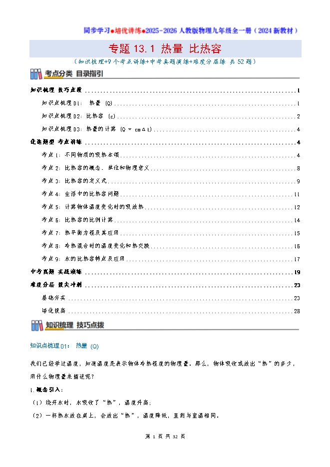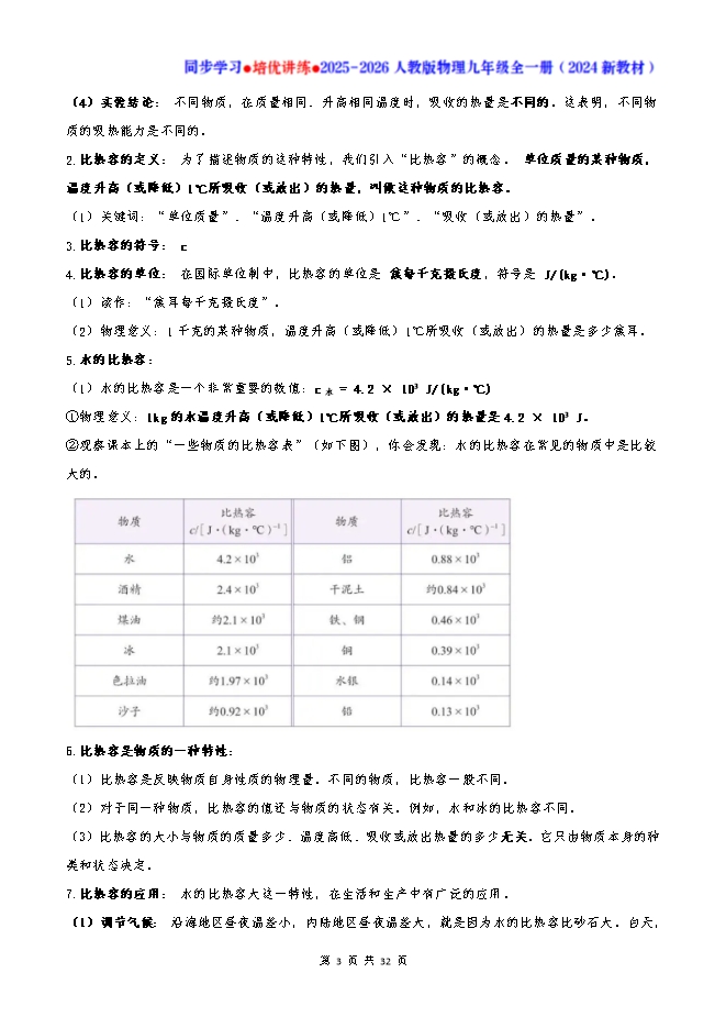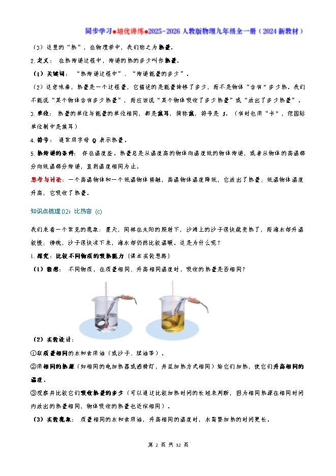 【内容简介】知识点梳理01: 热量 (Q)我们已经学过温度,知道温度是表示物体冷热程度的物理量。那么,物体吸收或放出“热”的多少,用什么物理量来描述呢?1.概念引入:(1)烧开水时,水吸收了“热”,温度升高;(2)一杯热水放在桌上,会放出“热”,温度降低,直到与室温相同。(3)这里的“热”,在物理学中,我们称之为热量。2.定义: 在热传递过程中,传递的热的多少叫作热量。(1)关键词: “热传递过程中”、“传递能量的多少”。(2)这意味着,热量是一个过程量,它描述的是能量转移了多少,而不是物体“含有”多少热。我们不能说“某个物体含有多少热量”,而应该说“某个物体吸收了多少热量”或“放出了多少热量”。3.单位: 热量的单位与能量的单位相同,都是焦耳,简称焦,符号是 J。(有时也用“卡”,但国际单位制中是焦耳)4.符号: 通常用字母 Q 表示热量。5.热传递的条件: 存在温度差。热量总是从温度高的物体向温度低的物体传递,或者从物体的高温部分向低温部分传递,直到温度相同为止。思考与讨论:一个高温物体和一个低温物体接触,高温物体温度降低,它放出了热量;低温物体温度升高,它吸收了热量。知识点梳理02:比热容 (c)我们来看一个常见的现象:夏天,同样在太阳的照射下,沙滩上的沙子很快就变热了,而海水却升温较慢;傍晚,沙子很快凉下来,海水却仍然比较温暖。这是为什么呢?1.探究:比较不同物质的吸热能力 (课本实验思路)(1)猜想: 不同物质,在质量相同、升高相同温度时,吸收的热量是否相同?