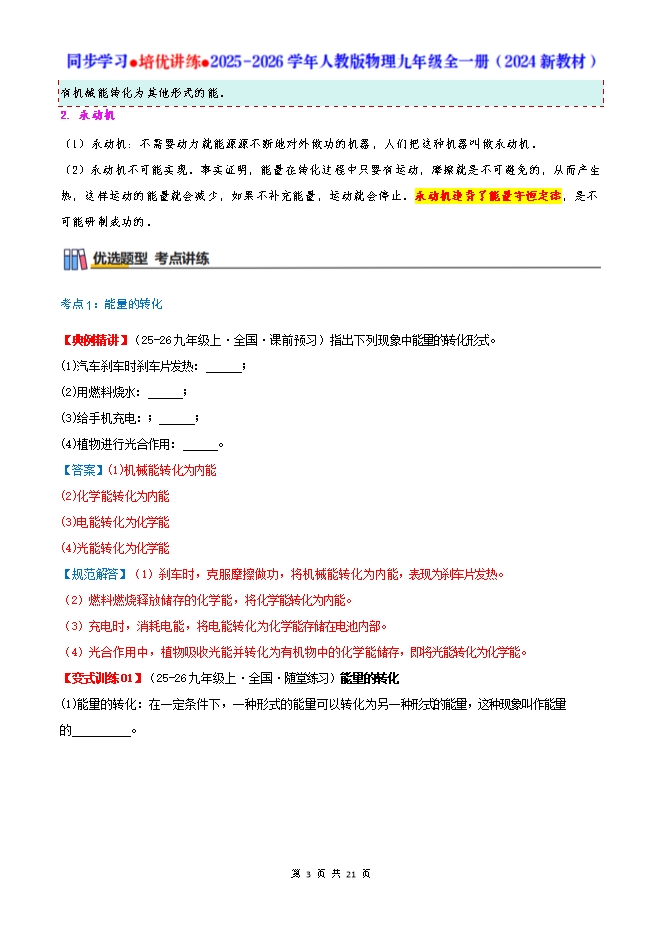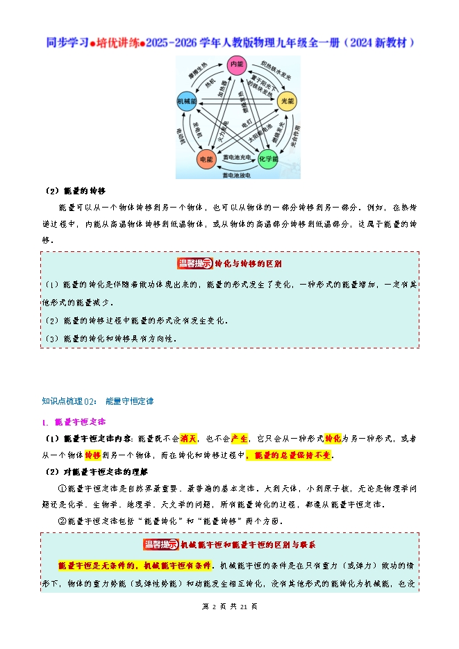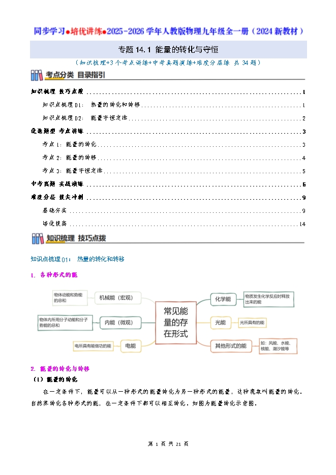 专题14.1 能量的转化与守恒--2025-2026人教版物理九年级全一册同步学习 培优讲练:知识梳理+考点讲练+中考真题演练+难度分层(试题版和答案版)