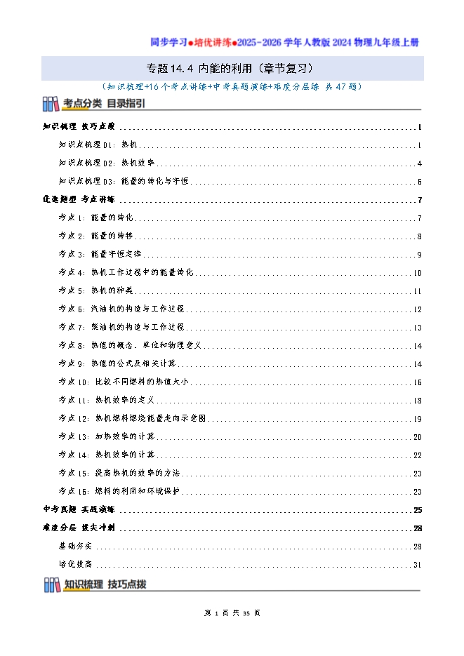 - 2612025-2026人教版物理九年级全一册培优卷:第十四章 内能的利用(附解析)