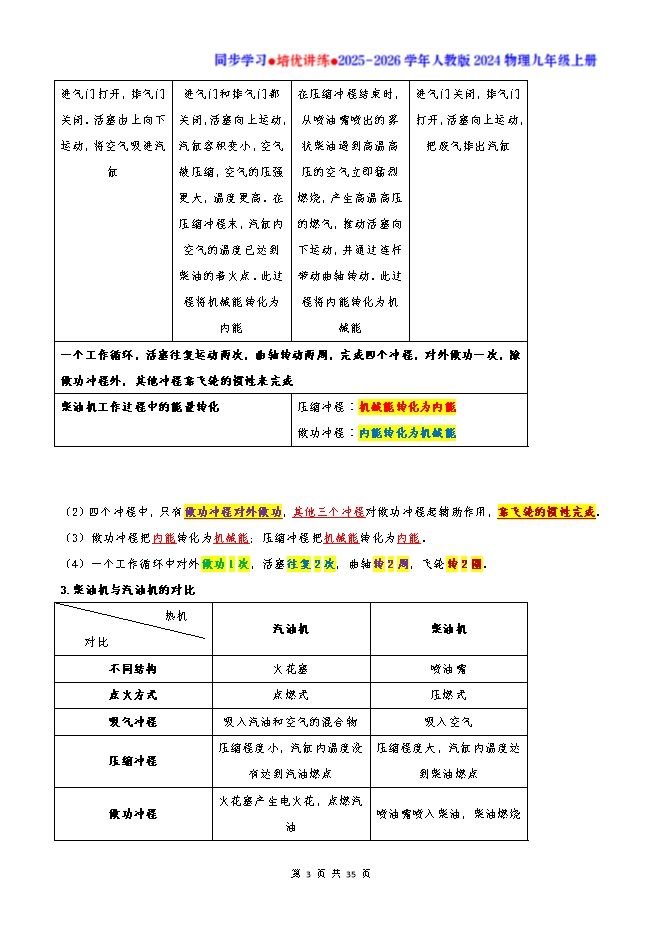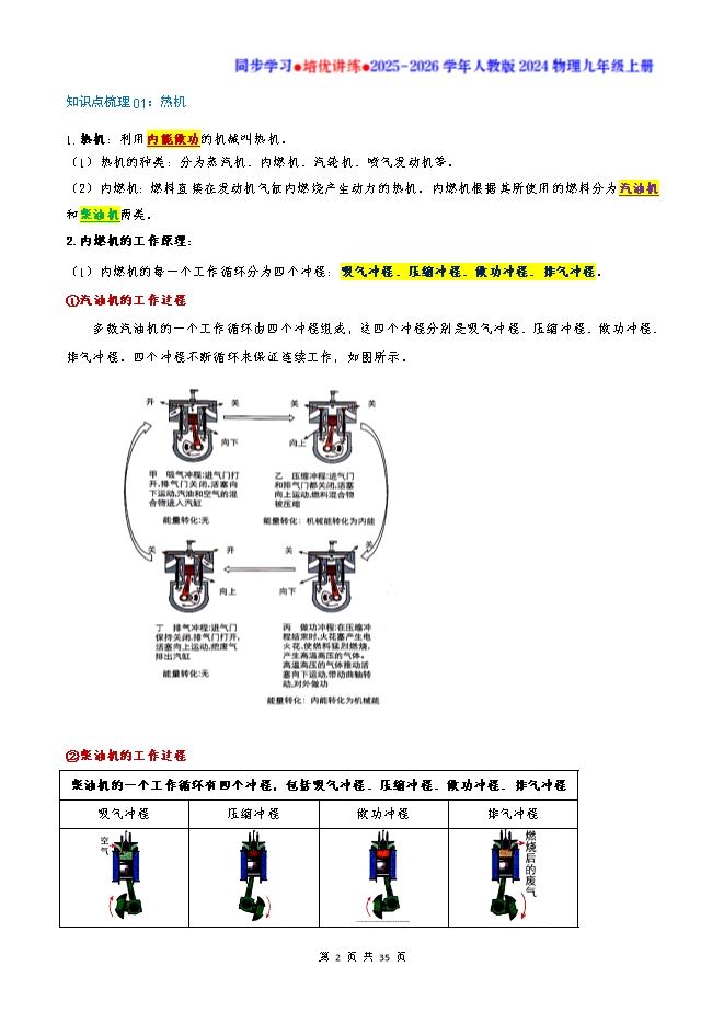 【内容简介】知识点梳理01:热机1.热机:利用内能做功的机械叫热机。(1)热机的种类:分为蒸汽机、内燃机、汽轮机、喷气发动机等。(2)内燃机:燃料直接在发动机气缸内燃烧产生动力的热机。内燃机根据其所使用的燃料分为汽油机和柴油机两类。2.内燃机的工作原理:(1)内燃机的每一个工作循环分为四个冲程:吸气冲程、压缩冲程、做功冲程、排气冲程。①汽油机的工作过程