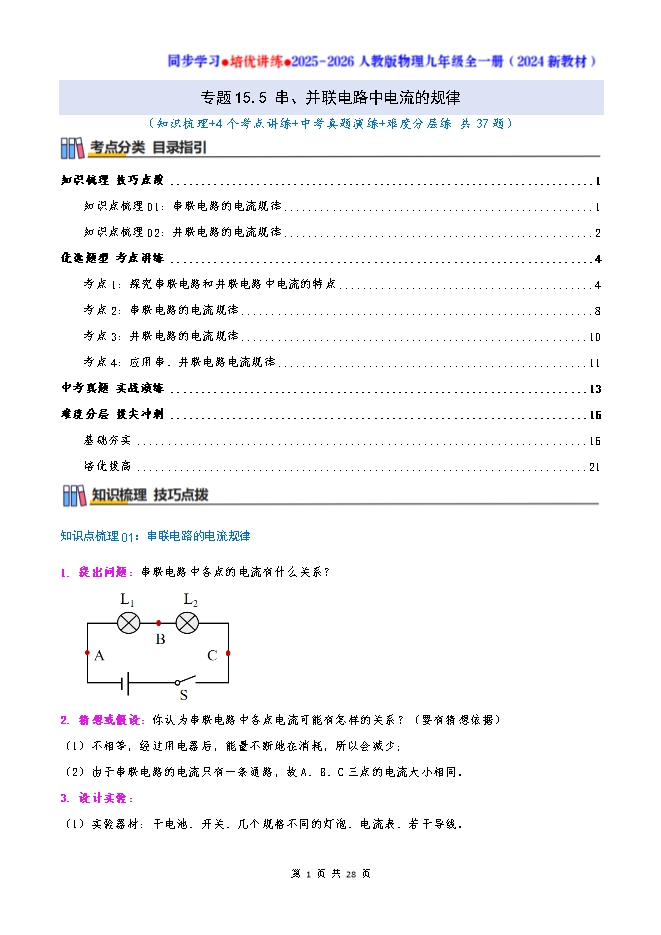 专题15.5 串、并联电路中电流的规律--2025-2026人教版物理九年级全一册同步学习 培优讲练:知识梳理+考点讲练+中考真题演练+难度分层(试题版和答案版)