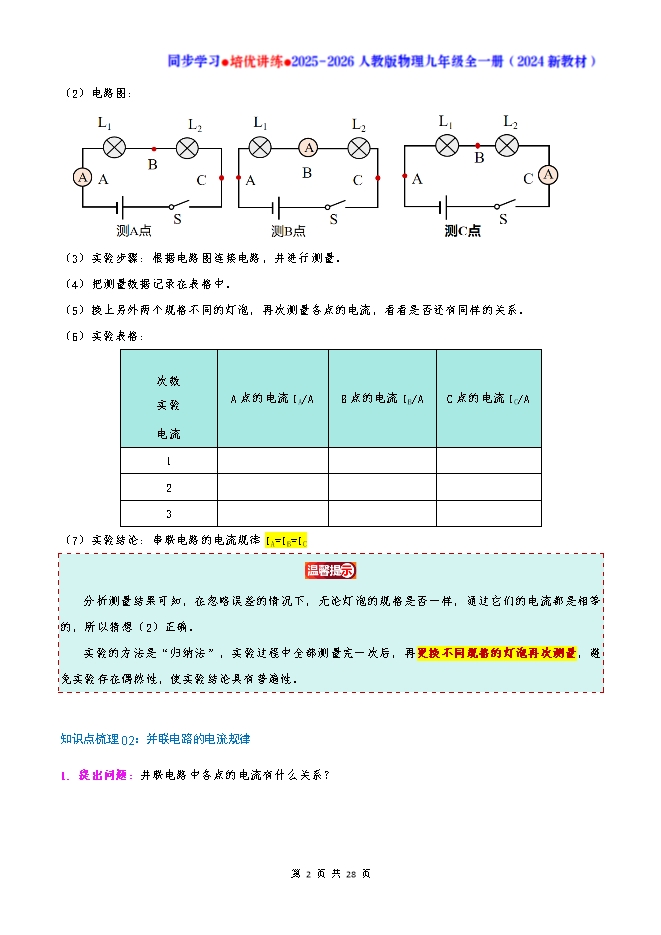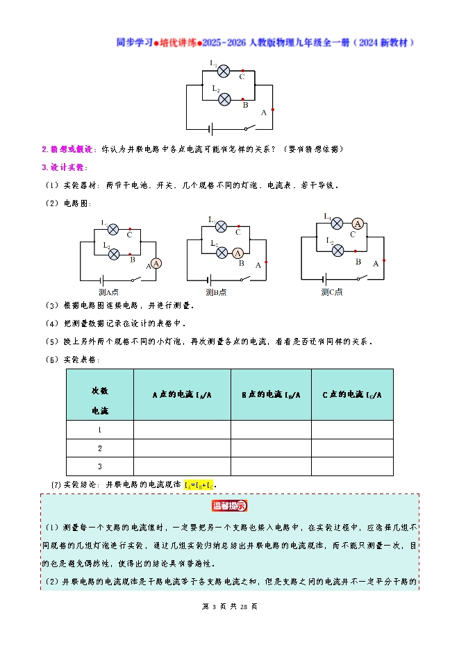 【内容简介】知识点梳理01:串联电路的电流规律1. 提出问题:串联电路中各点的电流有什么关系? 2. 猜想或假设:你认为串联电路中各点电流可能有怎样的关系?(要有猜想依据)(1)不相等,经过用电器后,能量不断地在消耗,所以会减少;(2)由于串联电路的电流只有一条通路,故A、B、C三点的电流大小相同。3. 设计实验:(1)实验器材:干电池、开关、几个规格不同的灯泡、电流表、若干导线。(2)电路图: (3)实验步骤:根据电路图连接电路,并进行测量。(4)把测量数据记录在表格中。(5)换上另外两个规格不同的灯泡,再次测量各点的电流,看看是否还有同样的关系。(6)实验表格:次数实验电流 A点的电流IA/A B点的电流IB/A C点的电流IC/A1 2 3 (7)实验结论:串联电路的电流规律IA=IB=IC 分析测量结果可知,在忽略误差的情况下,无论灯泡的规格是否一样,通过它们的电流都是相等的,所以猜想(2)正确。实验的方法是“归纳法”,实验过程中全部测量完一次后,再更换不同规格的灯泡再次测量,避免实验存在偶然性,使实验结论具有普遍性。知识点梳理02:并联电路的电流规律1. 提出问题:并联电路中各点的电流有什么关系?