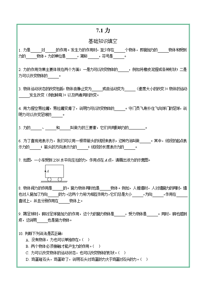 【内容简介】第七章 第一节 力—2025-2026学年人教版物理八年级下学期预习基础知识填空(附答案)