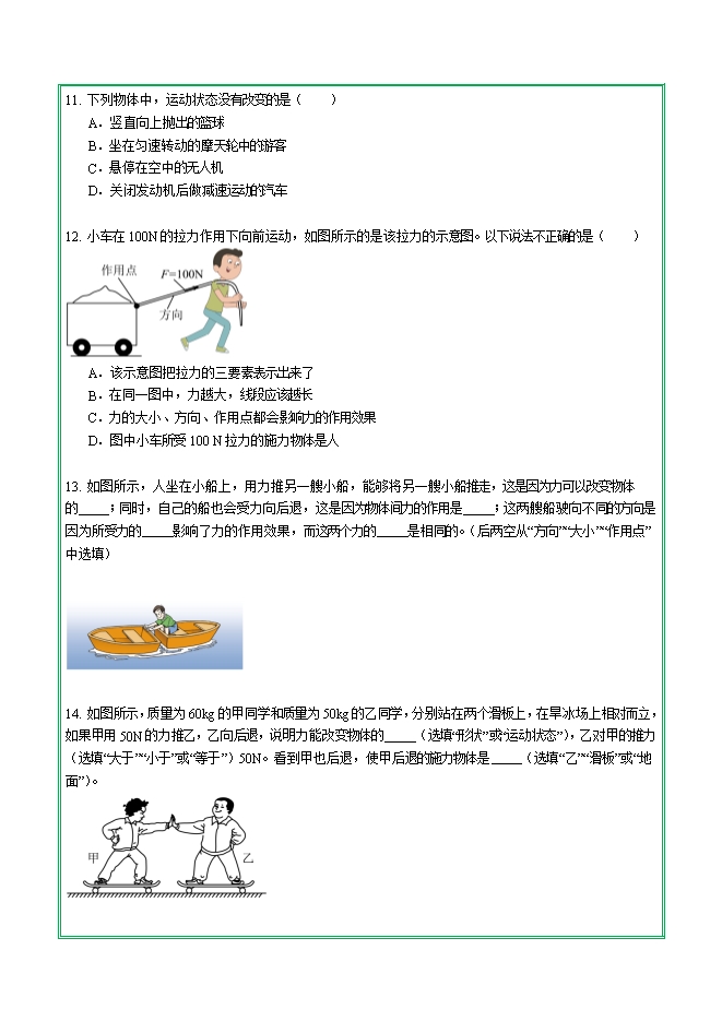 第七章 第一节 力—2025-2026学年人教版物理八年级下学期预习基础知识填空(附答案)