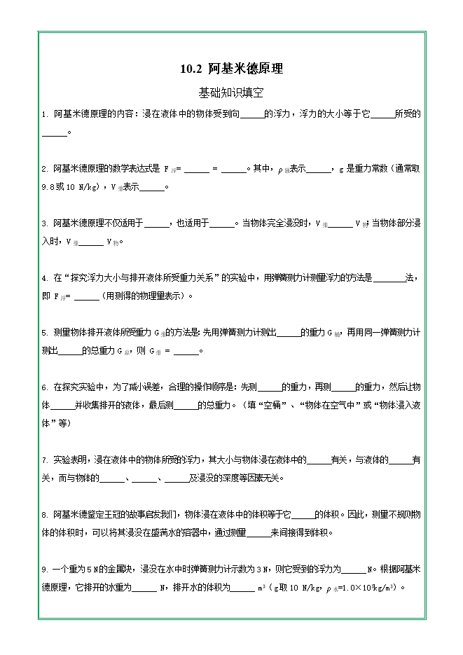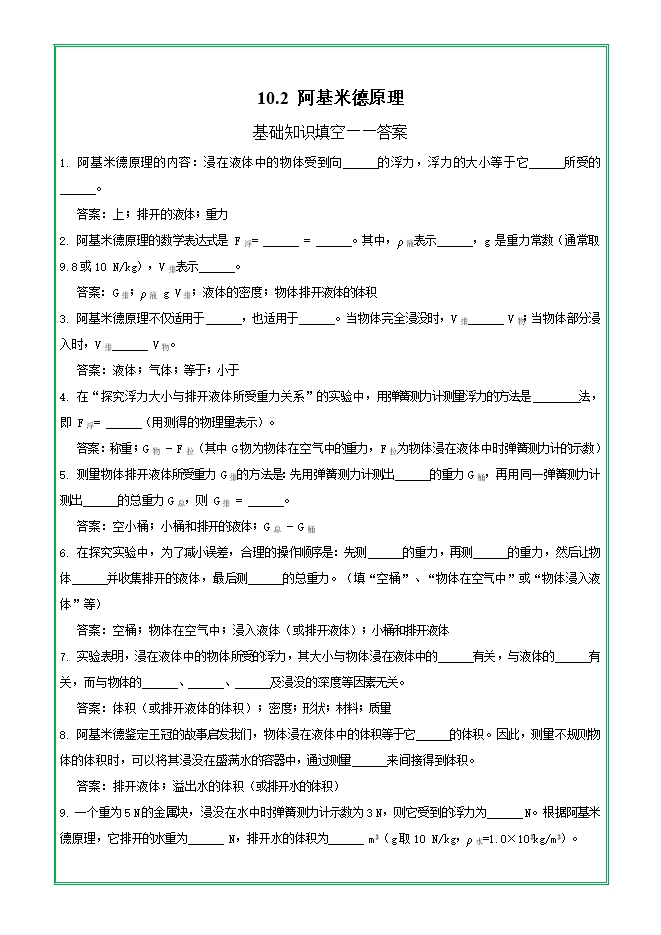 【内容简介】第十章 第二节 阿基米德原理—2025-2026学年人教版物理八年级下学期预习基础知识填空(附答案)