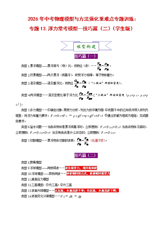 【内容简介】2026年中考物理模型与方法强化重难点专题训练:专题13.浮力常考模型—技巧篇(二)(学生版和教师版)