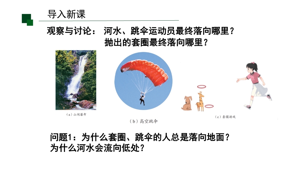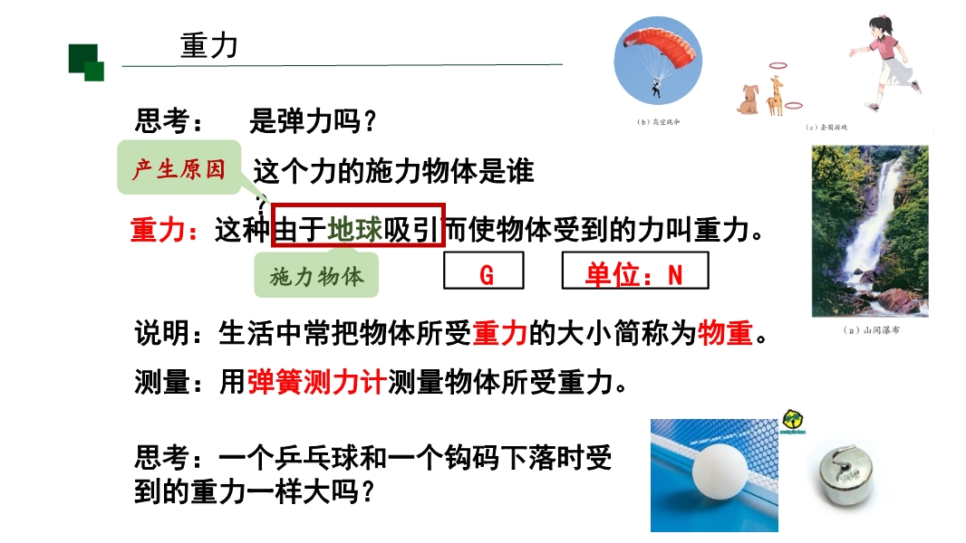 【内容简介】该课件聚焦重力的产生、大小(G=mg)、方向(竖直向下)、作用点(重心)及力的示意图,通过观察河水、跳伞运动员等落向地面的现象提问,引导学生思考,搭建连接力的概念与重力学习的支架。其亮点是以科学探究为主线,通过测钩码重力实验、数据表格分析培养科学思维,结合铅垂线应用体现科学态度与责任。如实验方案设计、例题计算、自制铅垂线实践,助力学生提升探究与应用能力,为教师提供完整教学流程与活动设计。