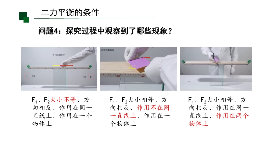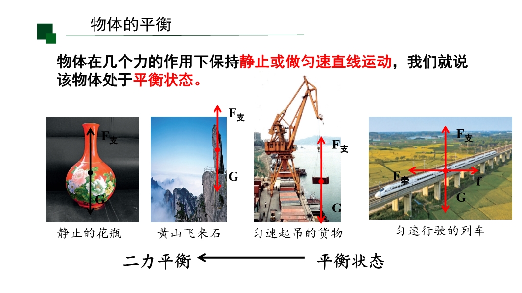【内容简介】该课件聚焦“二力平衡”核心知识点,通过高空走钢丝现象导入,引导学生观察静止花瓶、匀速行驶列车等实例建立平衡状态概念,再通过实验探究二力平衡条件,最后关联第七章摩擦力测量实验,构建完整知识脉络。其亮点在于以问题链驱动科学探究,用轻质卡片实验控制重力影响,分析不同受力条件现象得出“同体、等大、反向、共线”结论,体现科学思维与探究素养。小结结构化呈现要点,结合生活实例,助力学生形成物理观念,教师可借助其互动设计提升教学效率。