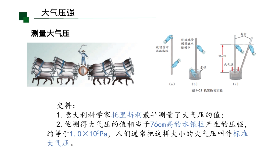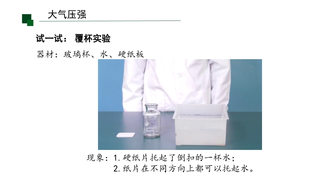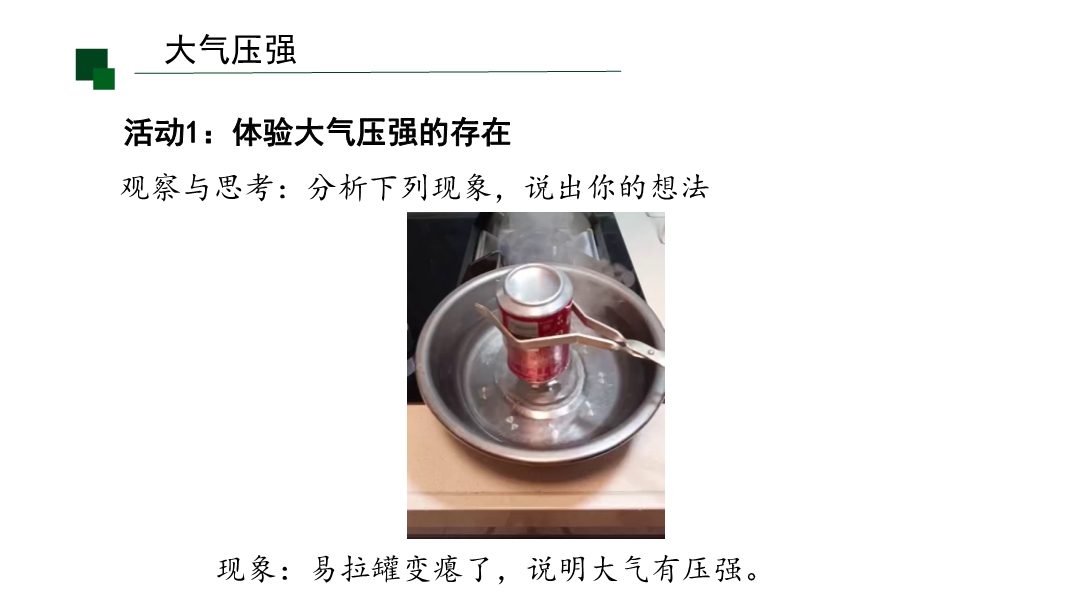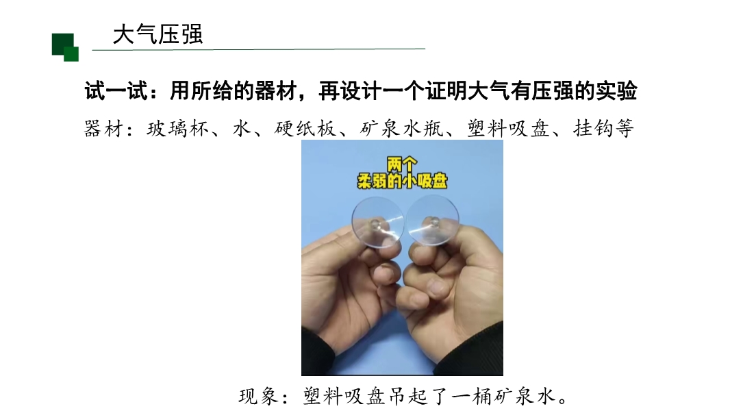 【内容简介】课件聚焦“大气压强”核心知识点,通过“好玩的气体实验”导入激发兴趣,以易拉罐变瘪、覆杯实验等体验活动为支架,引导学生从感知大气压存在,到马德堡半球实验验证,再到托里拆利实验测量及估测实验,构建完整知识脉络。其亮点在于以科学探究为核心,通过塑料吸盘吊矿泉水、注射器估测大气压等实验培养科学探究能力,结合误差分析(如空气未排尽、摩擦影响)发展科学思维,小结系统梳理知识点助力物理观念形成。学生通过动手实验深化理解,教师可借助丰富活动提升教学效率。