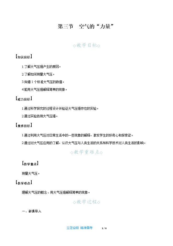 - 3368.3 空气的“力量”--2024新沪科版物理八年级下学期科学素养新教学设计(附教学反思)