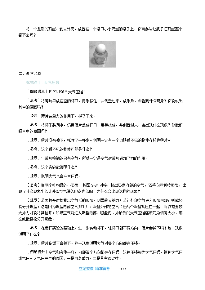 【内容简介】一、新课导入将一个煮熟的鸡蛋,剥去外壳,放置在一个瓶口小于鸡蛋的瓶子上,你有办法让瓶子把鸡蛋整个吞下去吗? 二、教学步骤探究点1 大气压强[阅读课本]P195~196“大气压强”[思考]将薄片平放在空的杯口,用手按住,并倒置过来,放手后,会看到什么现象?你能说出其中的原因吗?[提示]薄片在重力的作用下,掉了下来。[思考]将杯子装满水,仍用薄片盖住杯口,用手按住,并倒置过来,会出现什么现象?你能解释其中的原因吗?[提示]薄片没有掉下,托住了一杯水。说明一定有一个肉眼看不见的物体在托住薄片。[思考]这个看不见的物体可能是什么?[提示]与薄片接触的只有空气,所以一定是空气对薄片施加了力的作用。[思考]这个实验能说明什么?[提示]说明大气也会产生压强。[思考]取两个挂物品的小吸盘,按图8⁃34对接,挤出吸盘内部的空气,双手向两侧拉吸盘,出现了什么现象?若让外部空气进入吸盘内部呢,为什么会出现这样的现象?[提示]若要拉开对接排出空气后的吸盘,则需较大的力;若让外部空气进入吸盘内部,则能轻松分开吸盘。这是因为吸盘内部空气排出后,吸盘外部的空气会把两个吸盘紧压在一起,所以需要较大外力才能将其拉开。如果空气能进入吸盘内部,吸盘内、外所受的大气压强逐渐变为相同大小,那么就能轻松分开吸盘。[思考]在覆杯实验的基础上,进一步转动杯子,让杯口朝不同方向,薄片会掉下吗?这一现象说明了什么?