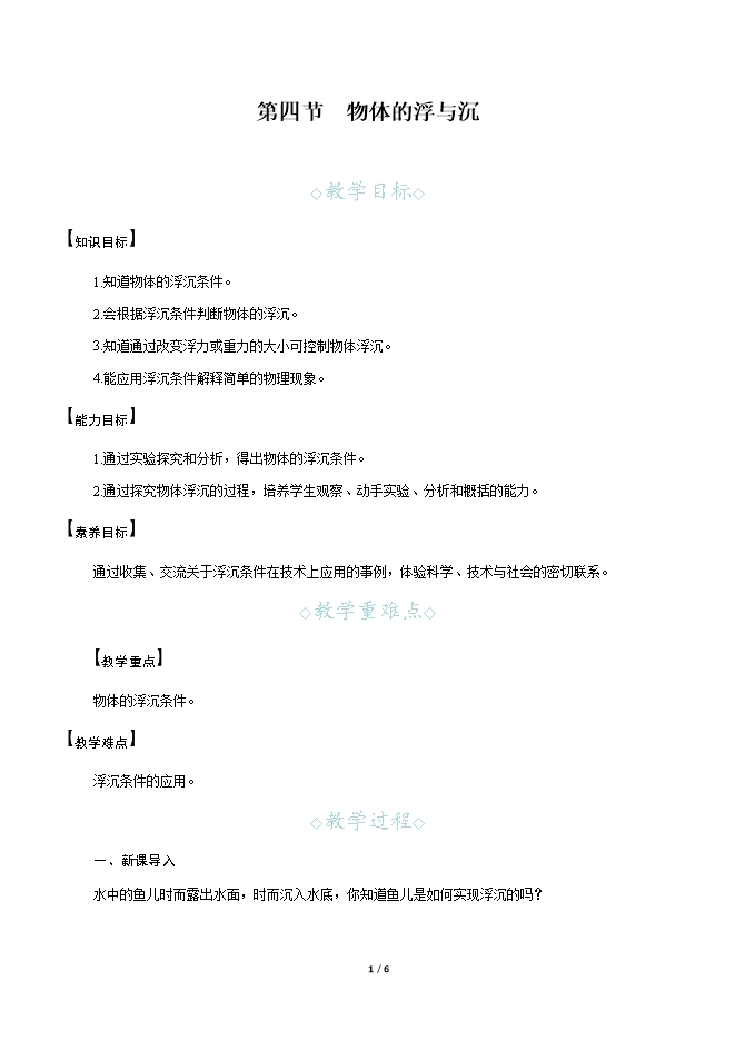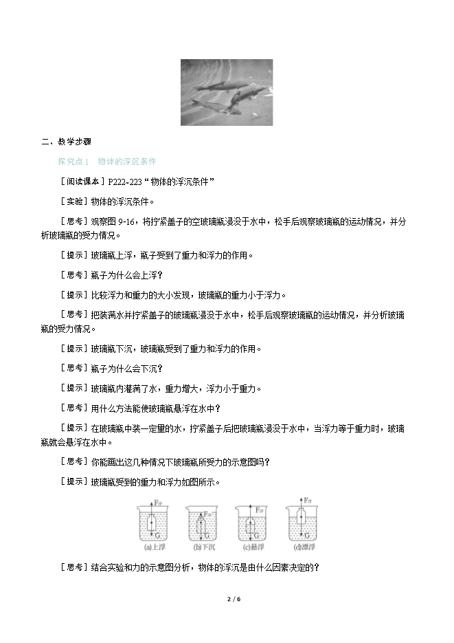 【内容简介】一、新课导入水中的鱼儿时而露出水面,时而沉入水底,你知道鱼儿是如何实现浮沉的吗? 二、教学步骤探究点1 物体的浮沉条件[阅读课本]P222~223“物体的浮沉条件”[实验]物体的浮沉条件。[思考]观察图9⁃16,将拧紧盖子的空玻璃瓶浸没于水中,松手后观察玻璃瓶的运动情况,并分析玻璃瓶的受力情况。[提示]玻璃瓶上浮,瓶子受到了重力和浮力的作用。[思考]瓶子为什么会上浮?[提示]比较浮力和重力的大小发现,玻璃瓶的重力小于浮力。[思考]把装满水并拧紧盖子的玻璃瓶浸没于水中,松手后观察玻璃瓶的运动情况,并分析玻璃瓶的受力情况。[提示]玻璃瓶下沉,玻璃瓶受到了重力和浮力的作用。[思考]瓶子为什么会下沉?[提示]玻璃瓶内灌满了水,重力增大,浮力小于重力。[思考]用什么方法能使玻璃瓶悬浮在水中?[提示]在玻璃瓶中装一定量的水,拧紧盖子后把玻璃瓶浸没于水中,当浮力等于重力时,玻璃瓶就会悬浮在水中。[思考]你能画出这几种情况下玻璃瓶所受力的示意图吗?