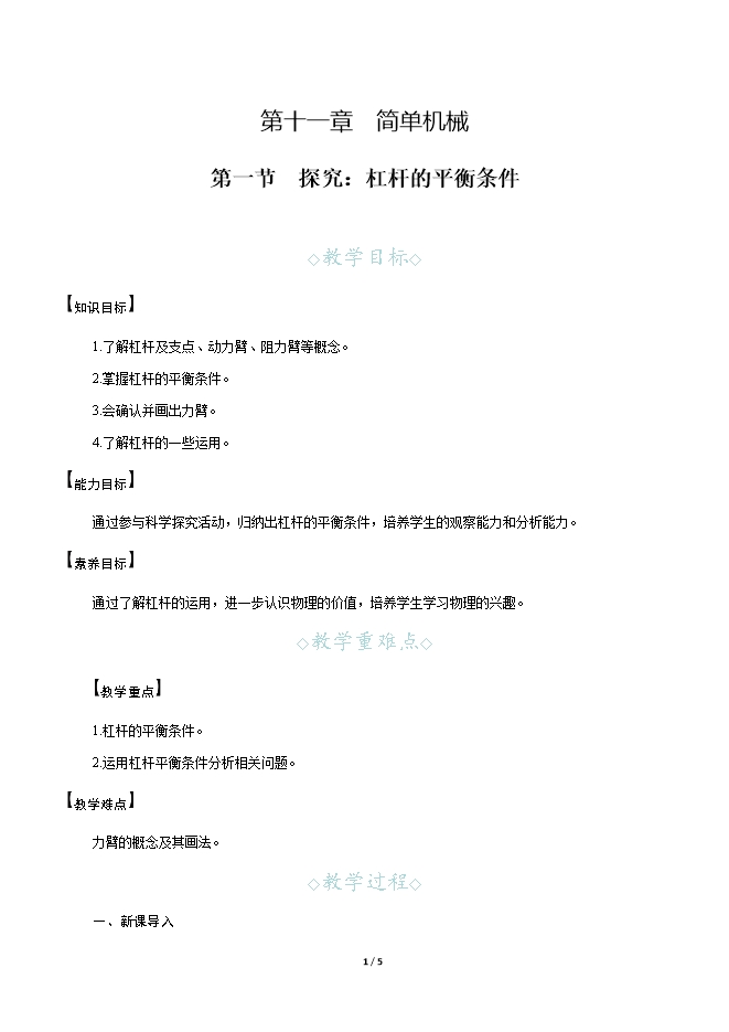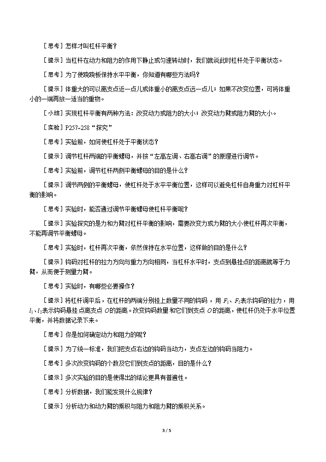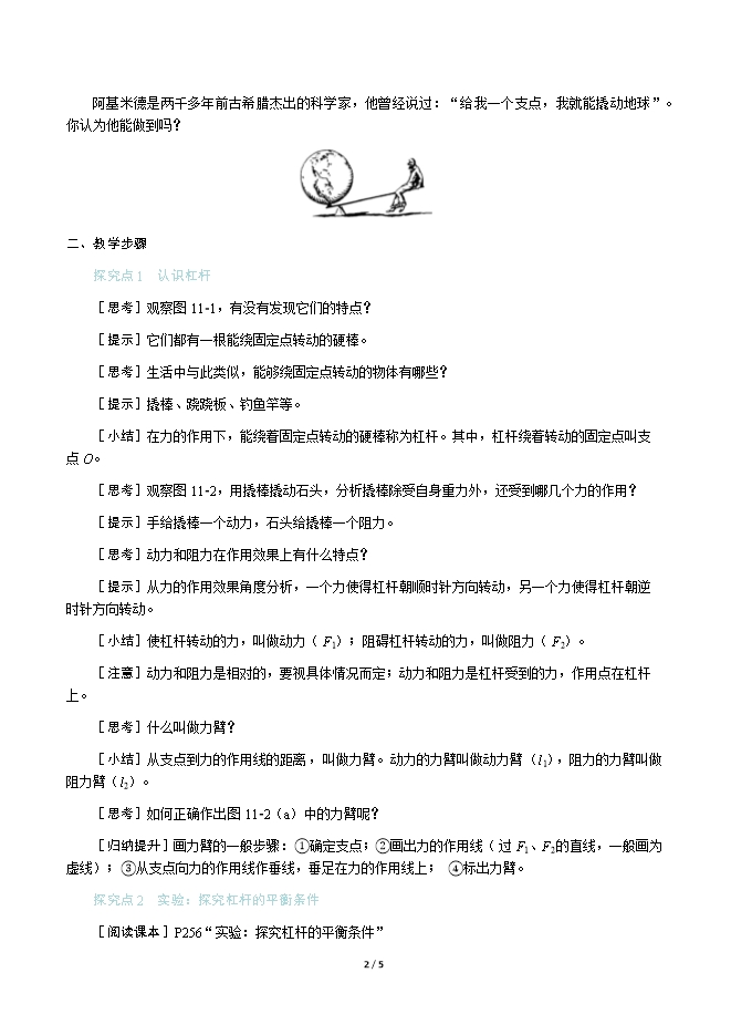 【内容简介】一、新课导入阿基米德是两千多年前古希腊杰出的科学家,他曾经说过:“给我一个支点,我就能撬动地球”。你认为他能做到吗? 二、教学步骤探究点1 认识杠杆[思考]观察图11⁃1,有没有发现它们的特点?[提示]它们都有一根能绕固定点转动的硬棒。[思考]生活中与此类似,能够绕固定点转动的物体有哪些?[提示]撬棒、跷跷板、钓鱼竿等。[小结]在力的作用下,能绕着固定点转动的硬棒称为杠杆。其中,杠杆绕着转动的固定点叫支点O。[思考]观察图11⁃2,用撬棒撬动石头,分析撬棒除受自身重力外,还受到哪几个力的作用?[提示]手给撬棒一个动力,石头给撬棒一个阻力。[思考]动力和阻力在作用效果上有什么特点?[提示]从力的作用效果角度分析,一个力使得杠杆朝顺时针方向转动,另一个力使得杠杆朝逆时针方向转动。[小结]使杠杆转动的力,叫做动力(F1);阻碍杠杆转动的力,叫做阻力(F2)。[注意]动力和阻力是相对的,要视具体情况而定;动力和阻力是杠杆受到的力,作用点在杠杆上。[思考]什么叫做力臂?[小结]从支点到力的作用线的距离,叫做力臂。动力的力臂叫做动力臂(l1),阻力的力臂叫做阻力臂(l2)。[思考]如何正确作出图11⁃2(a)中的力臂呢?[归纳提升]画力臂的一般步骤:①确定支点;②画出力的作用线(过F1、F2的直线,一般画为虚线);③从支点向力的作用线作垂线,垂足在力的作用线上;④标出力臂。