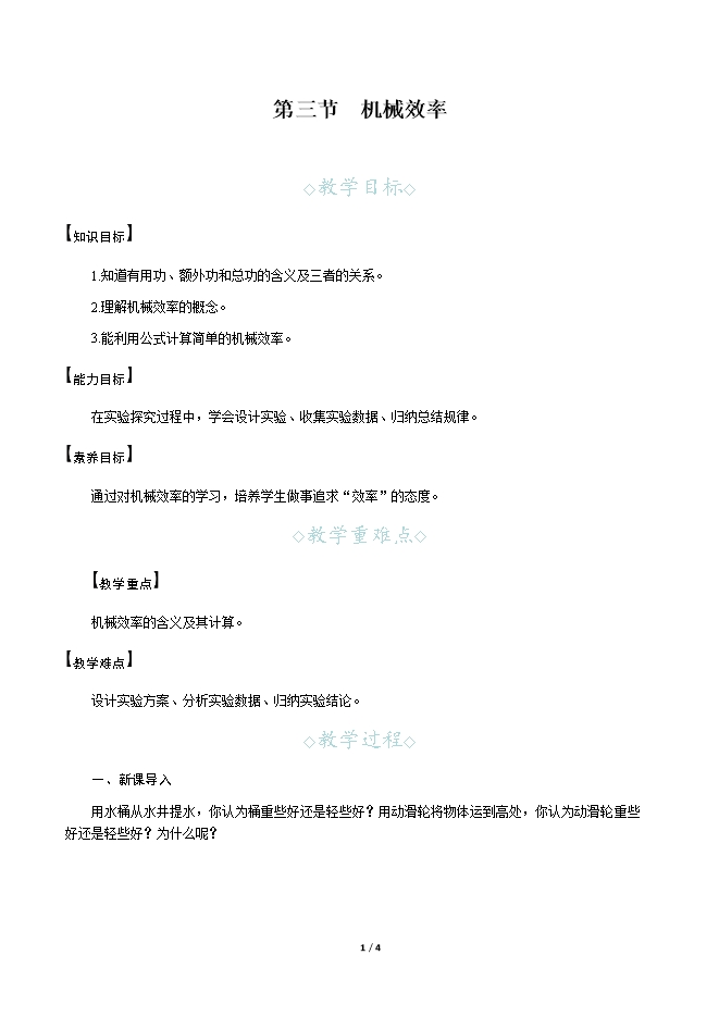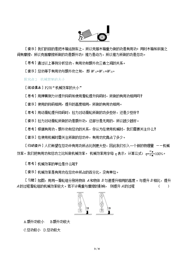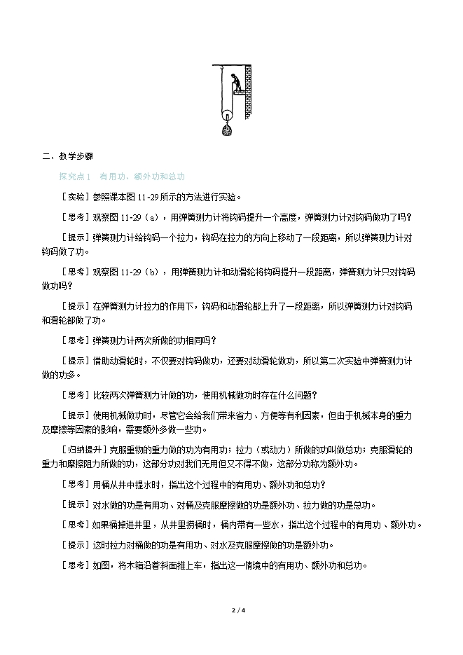 【内容简介】一、新课导入用水桶从水井提水,你认为桶重些好还是轻些好?用动滑轮将物体运到高处,你认为动滑轮重些好还是轻些好?为什么呢? 二、教学步骤探究点1 有用功、额外功和总功[实验]参照课本图11⁃29所示的方法进行实验。[思考]观察图11⁃29(a),用弹簧测力计将钩码提升一个高度,弹簧测力计对钩码做功了吗?[提示]弹簧测力计给钩码一个拉力,钩码在拉力的方向上移动了一段距离,所以弹簧测力计对钩码做了功。[思考]观察图11⁃29(b),用弹簧测力计和动滑轮将钩码提升一段距离,弹簧测力计只对钩码做功吗?[提示]在弹簧测力计拉力的作用下,钩码和动滑轮都上升了一段距离,所以弹簧测力计对钩码和滑轮都做了功。[思考]弹簧测力计两次所做的功相同吗?[提示]借助动滑轮时,不仅要对钩码做功,还要对动滑轮做功,所以第二次实验中弹簧测力计做的功多。[思考]比较两次弹簧测力计做的功,使用机械做功时存在什么问题?[提示]使用机械做功时,尽管它会给我们带来省力、方便等有利因素,但由于机械本身的重力及摩擦等因素的影响,需要额外多做一些功。[归纳提升]克服重物的重力做的功为有用功;拉力(或动力)所做的功叫做总功;克服滑轮的重力和摩擦阻力所做的功,这部分功对我们无用但又不得不做,这部分功称为额外功。[思考]用桶从井中提水时,指出这个过程中的有用功、额外功和总功?[提示]对水做的功是有用功、对桶及克服摩擦做的功是额外功、拉力做的功是总功。[思考]如果桶掉进井里,从井里捞桶时,桶内带有一些水,指出这个过程中的有用功、额外功。[提示]这时拉力对桶做的功是有用功、对水及克服摩擦做的功是额外功。[思考]如图,将木箱沿着斜面推上车,指出这一情境中的有用功、额外功和总功。