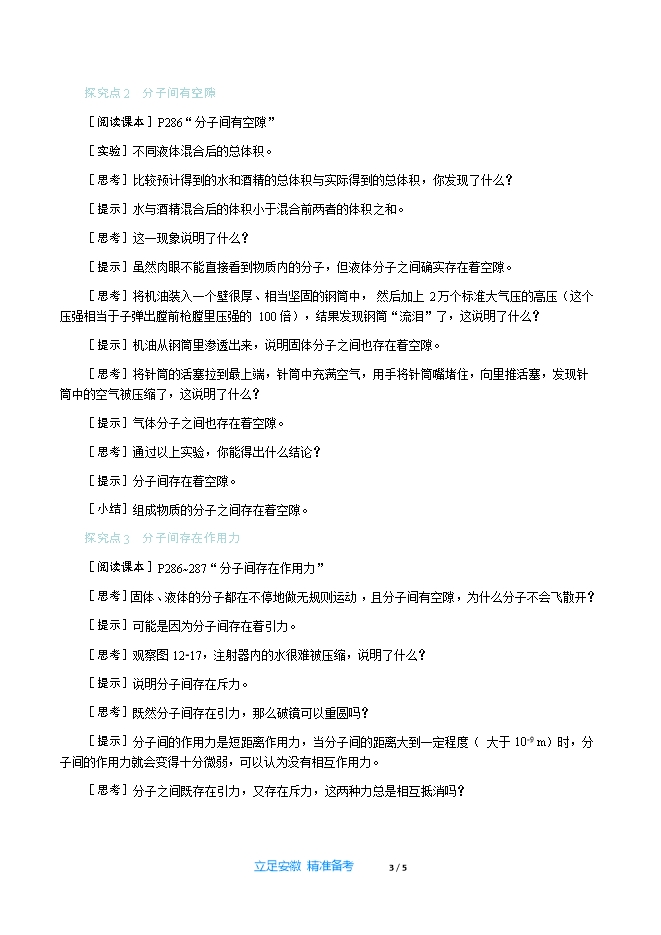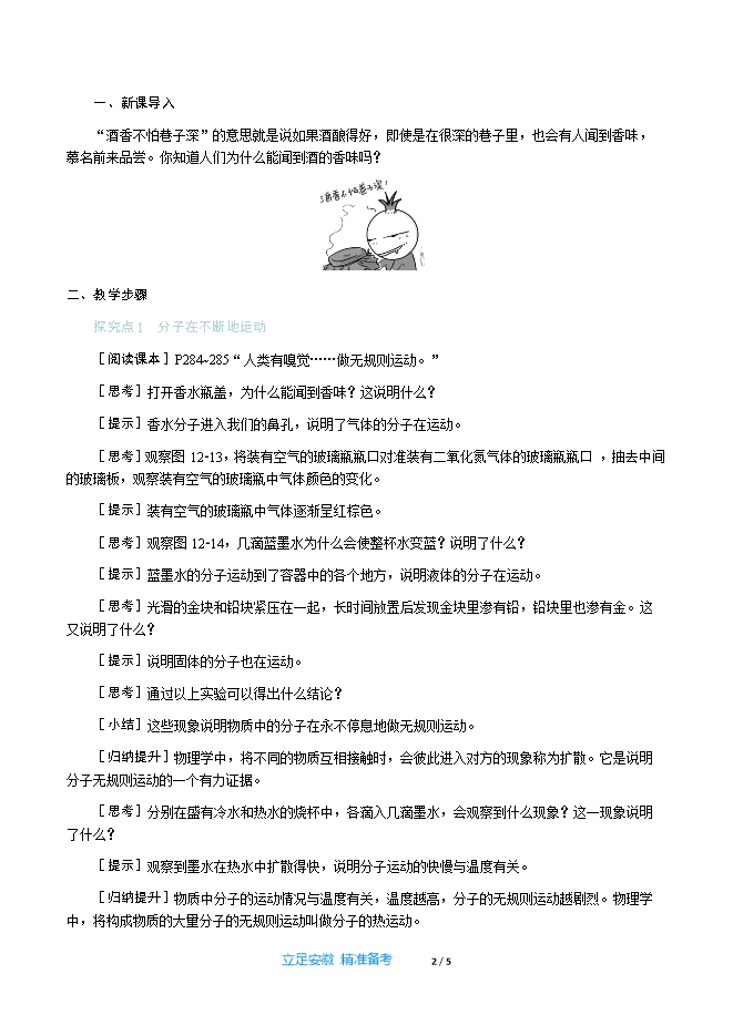 【内容简介】一、新课导入“酒香不怕巷子深”的意思就是说如果酒酿得好,即使是在很深的巷子里,也会有人闻到香味,慕名前来品尝。你知道人们为什么能闻到酒的香味吗? 二、教学步骤探究点1 分子在不断地运动[阅读课本]P284~285“人类有嗅觉……做无规则运动。”[思考]打开香水瓶盖,为什么能闻到香味?这说明什么?[提示]香水分子进入我们的鼻孔,说明了气体的分子在运动。[思考]观察图12⁃13,将装有空气的玻璃瓶瓶口对准装有二氧化氮气体的玻璃瓶瓶口,抽去中间的玻璃板,观察装有空气的玻璃瓶中气体颜色的变化。[提示]装有空气的玻璃瓶中气体逐渐呈红棕色。[思考]观察图12⁃14,几滴蓝墨水为什么会使整杯水变蓝?说明了什么?[提示]蓝墨水的分子运动到了容器中的各个地方,说明液体的分子在运动。[思考]光滑的金块和铅块紧压在一起,长时间放置后发现金块里渗有铅,铅块里也渗有金。这又说明了什么?[提示]说明固体的分子也在运动。[思考]通过以上实验可以得出什么结论?[小结]这些现象说明物质中的分子在永不停息地做无规则运动。[归纳提升]物理学中,将不同的物质互相接触时,会彼此进入对方的现象称为扩散。它是说明分子无规则运动的一个有力证据。[思考]分别在盛有冷水和热水的烧杯中,各滴入几滴墨水,会观察到什么现象?这一现象说明了什么?[提示]观察到墨水在热水中扩散得快,说明分子运动的快慢与温度有关。[归纳提升]物质中分子的运动情况与温度有关,温度越高,分子的无规则运动越剧烈。物理学中,将构成物质的大量分子的无规则运动叫做分子的热运动。