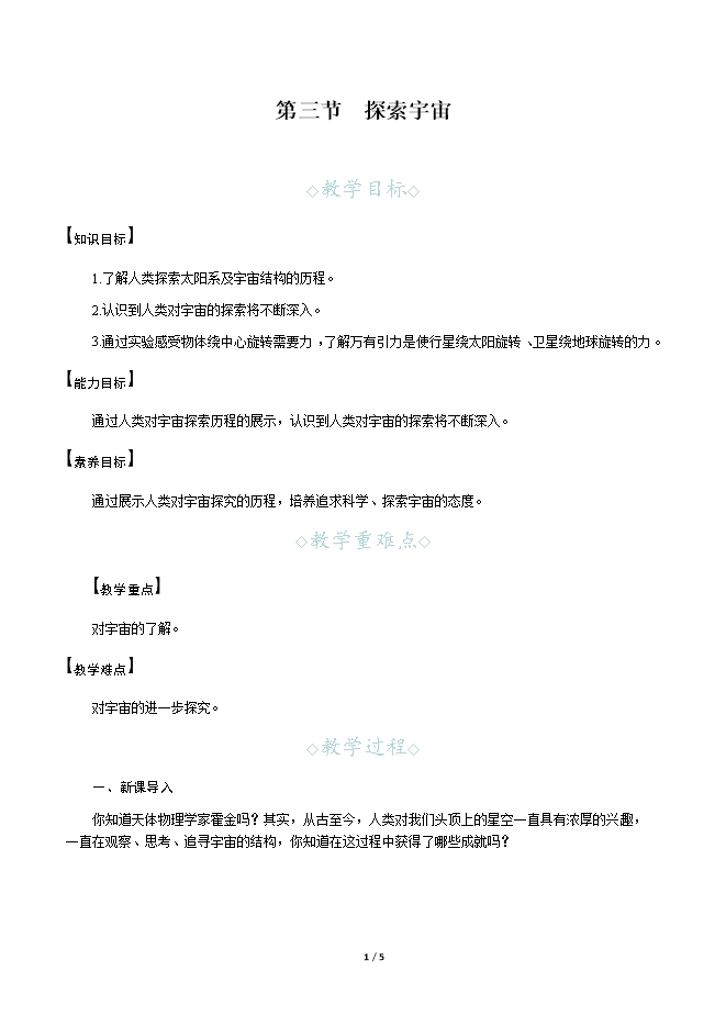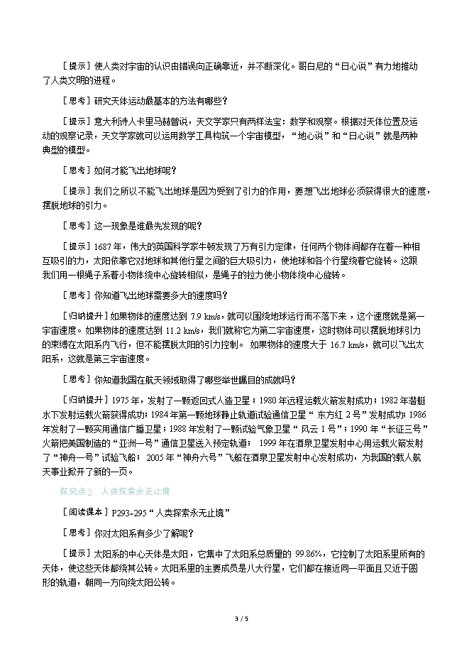 【内容简介】一、新课导入你知道天体物理学家霍金吗?其实,从古至今,人类对我们头顶上的星空一直具有浓厚的兴趣,一直在观察、思考、追寻宇宙的结构,你知道在这过程中获得了哪些成就吗? 二、教学步骤探究点1 探索太空[阅读课本]P290~292“探索太空”[思考]我国古代的宇宙图景是怎样的呢?[提示]浑天说最初认为:地球不是孤零零地悬在空中的,而是浮在水上;后来又有发展,认为地球浮在气中,因此有可能回旋浮动,这就是“地有四游”的朴素地动说的先河。浑天说认为全天恒星都分布于一个“天球”上,而日月五星则附于“天球”上运行,这与现代天文学的天球概念十分接近。[思考]古埃及人的宇宙图景是怎样的呢?[提示]古埃及人认为:大地犹如天井,周围尽是耸峙的高山,中间低洼平坦的地方是人类居住的地方。日月星辰悬挂在天井的上方,照耀大地。[思考]托勒密地心说的内容是什么?[提示]古希腊的天文学家托勒密认为地球处于宇宙中心静止不动,月球、水星、金星、太阳及其他行星都绕着地球运转,恒星都镶嵌在最外边的天球上。[思考]托勒密地心说的成就有哪些?[提示]地心说能够解释日食、月食等许多天文现象。[思考]托勒密的地心说对科学发展有什么影响?[提示]后来被宗教利用,成为禁锢人们思想的枷锁,阻碍了科学前进的步伐。