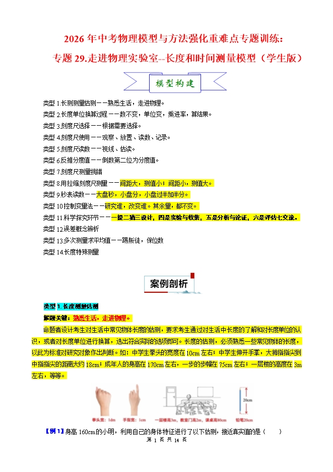【内容简介】2026年中考物理模型与方法强化重难点专题训练:专题29.走进物理实验室--长度和时间测量模型(学生版和教师版)