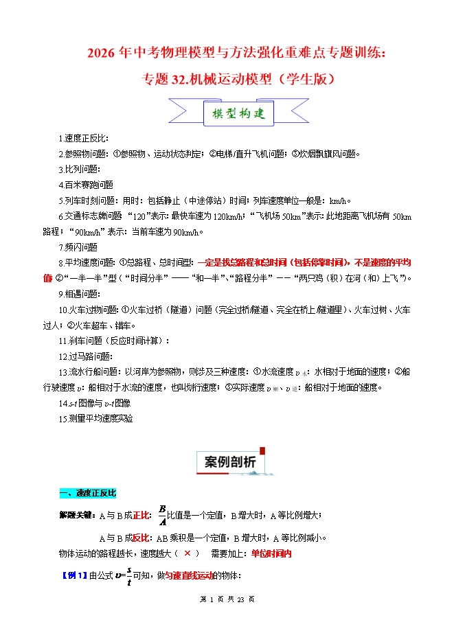 【内容简介】2026年中考物理模型与方法强化重难点专题训练:专题32.机械运动模型(学生版和教师版)