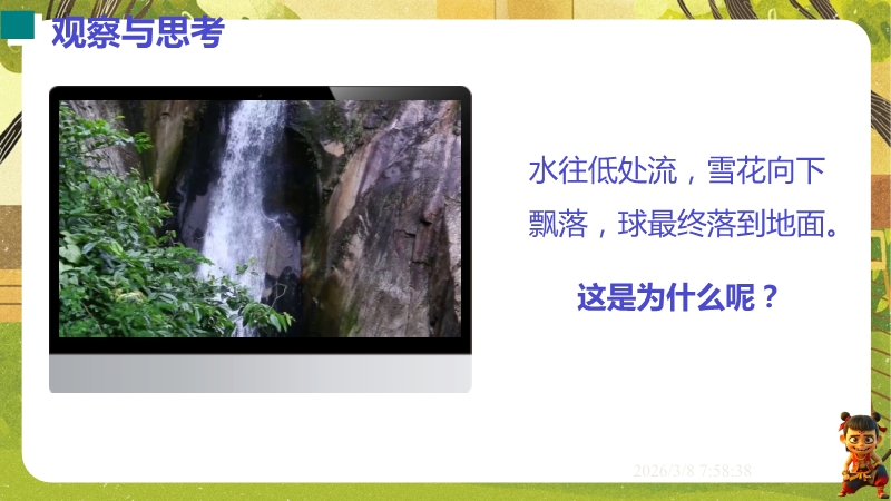 【内容简介】课件围绕“重力”展开,涵盖定义、方向、大小及重心等核心知识点。通过“水往低处流”等生活现象导入,从运动状态改变引出受力分析,逐步引导学生建立重力概念,形成连贯的学习支架。其亮点在于融合科学探究与情境应用,通过铅垂线演示实验、G-m关系探究实验培养学生科学思维与探究能力,结合嫦娥四号、神舟二十号等科技案例及传统文化元素,渗透科学态度与责任。结构化小结帮助学生系统掌握知识,丰富素材助力教师高效教学,提升学生物理观念与实践能力。