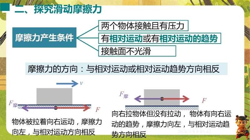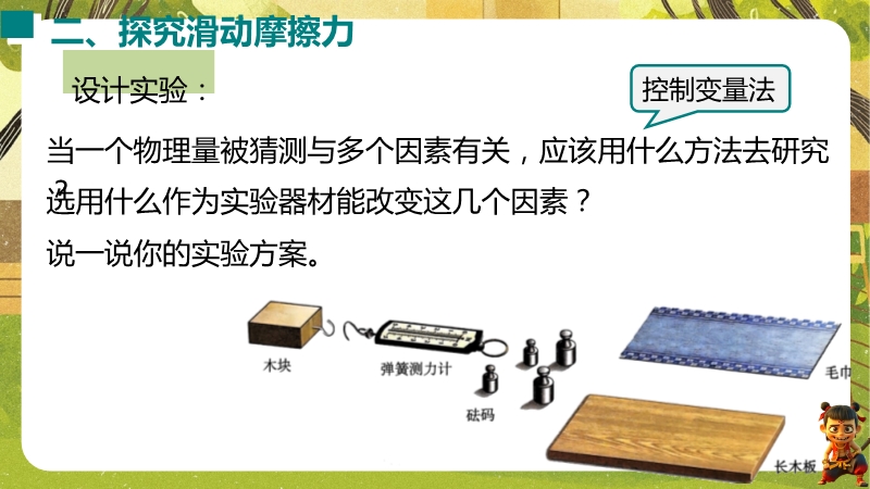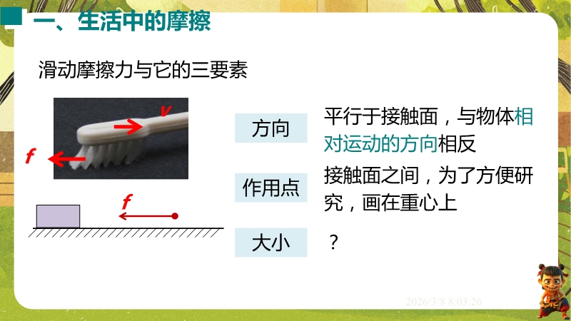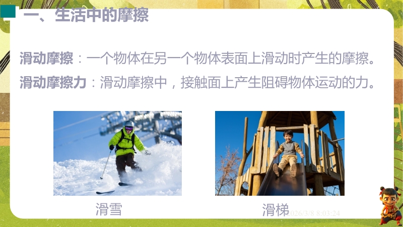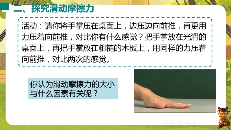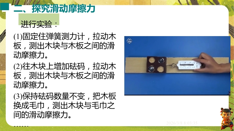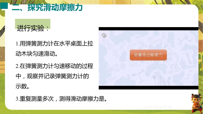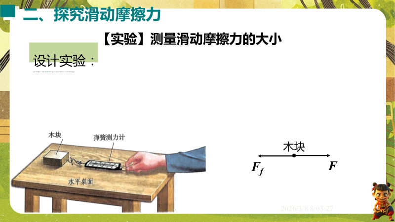 【内容简介】课件聚焦滑动摩擦力,通过“两本书互拉”观察活动及滑雪、滑梯等生活实例导入,构建“生活现象-摩擦力概念-实验探究-应用”的学习脉络,以基础题、实验步骤等为支架,帮助学生逐步理解摩擦力的定义、产生条件及三要素。其亮点在于以科学探究为核心,通过“测量滑动摩擦力”实验及控制变量法设计,培养学生科学思维与实验能力,融入中考题及生活情境题,强化知识应用。采用实验引导与问题驱动教学,助力学生构建运动和相互作用观念,也为教师提供分层教学资源,提升教学效率。