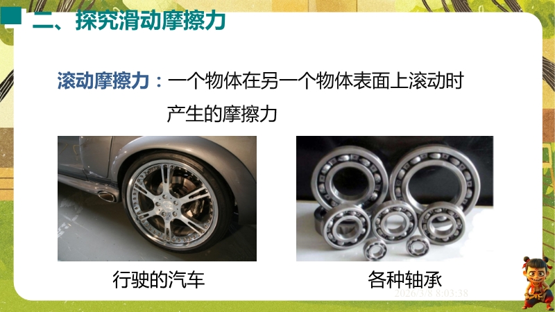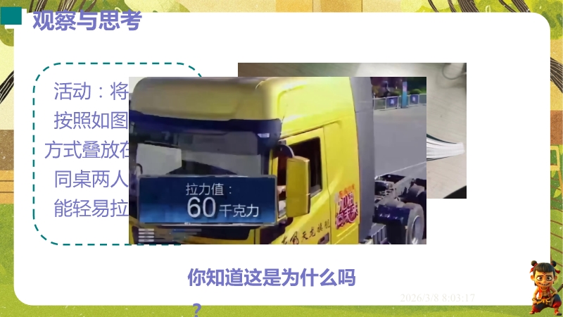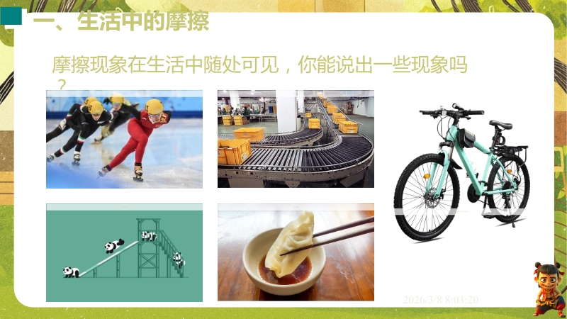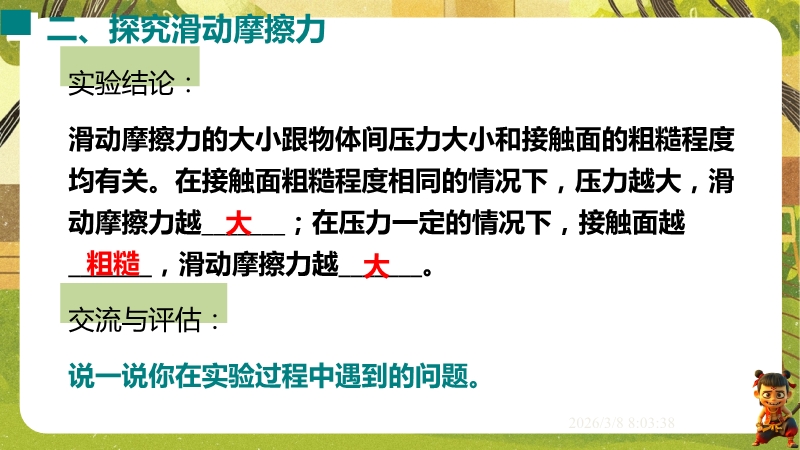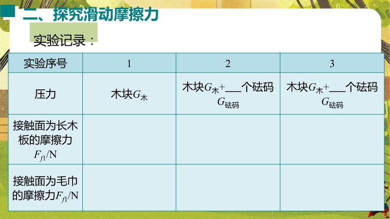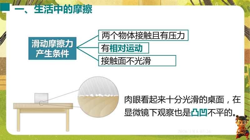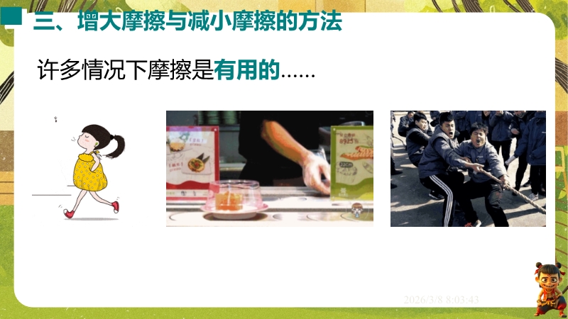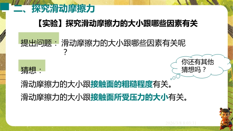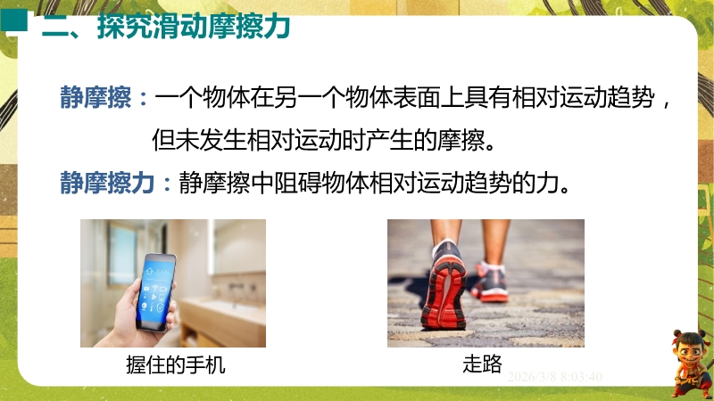 【内容简介】课件聚焦滑动摩擦力,通过“两本书互拉”观察活动及滑雪、滑梯等生活实例导入,构建“生活现象-摩擦力概念-实验探究-应用”的学习脉络,以基础题、实验步骤等为支架,帮助学生逐步理解摩擦力的定义、产生条件及三要素。其亮点在于以科学探究为核心,通过“测量滑动摩擦力”实验及控制变量法设计,培养学生科学思维与实验能力,融入中考题及生活情境题,强化知识应用。采用实验引导与问题驱动教学,助力学生构建运动和相互作用观念,也为教师提供分层教学资源,提升教学效率。