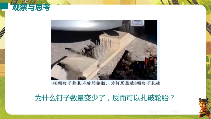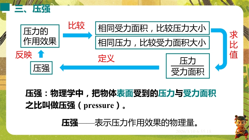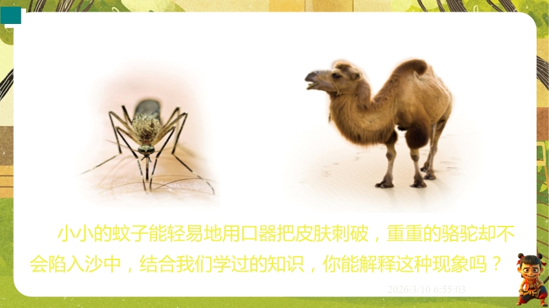 【内容简介】课件聚焦“压强”核心知识点,通过蚊子吸血、骆驼踏沙等生活现象导入,引导学生从压力的定义、方向、作用效果入手,经实验探究影响因素,逐步建立压强概念及公式,形成从现象到规律再到应用的学习脉络。其亮点在于以科学探究为主线,通过控制变量法和转换法设计实验,结合中考题和生活实例,培养科学思维与物理观念。学生能提升探究能力和知识应用能力,教师可借助丰富例题与结构化小结高效教学。