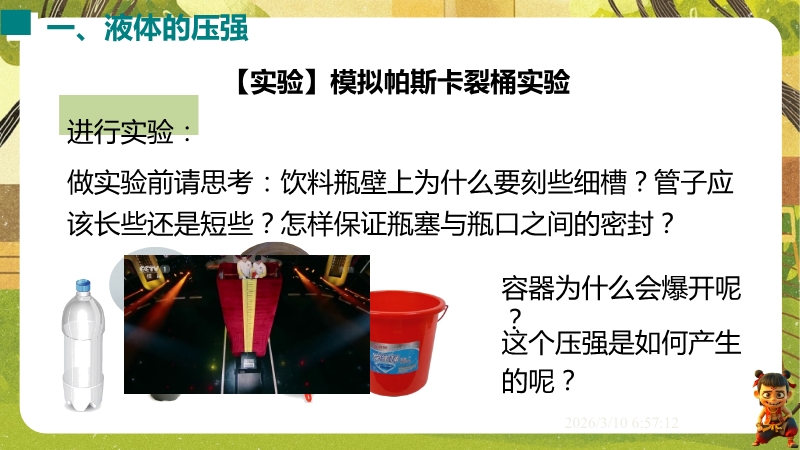 【内容简介】课件聚焦液体压强,涵盖特点、计算公式p=ρgh及连通器原理。以帕斯卡裂桶实验导入,通过模拟实验、U形管压强计探究等环节,构建从现象到规律的学习脉络,提供清晰学习支架。其亮点在于融合科学探究与科学思维,通过控制变量法、转换法设计实验,结合中考题及三峡船闸等实例,助学生深化物理观念。丰富习题与生活应用结合,既培养学生探究能力,又方便教师高效教学。