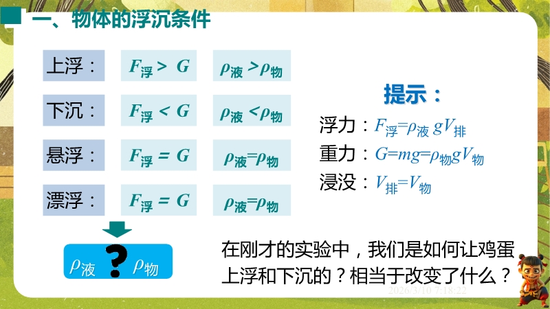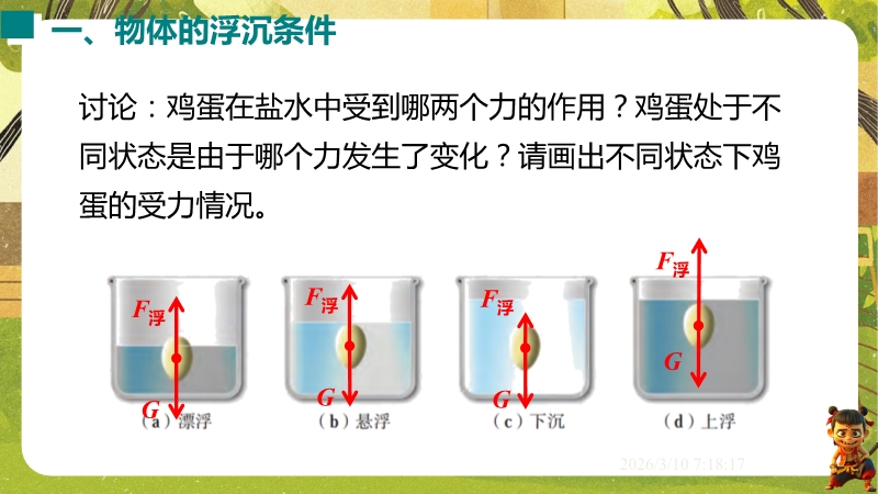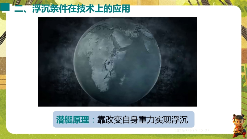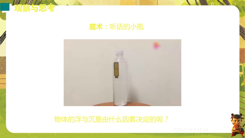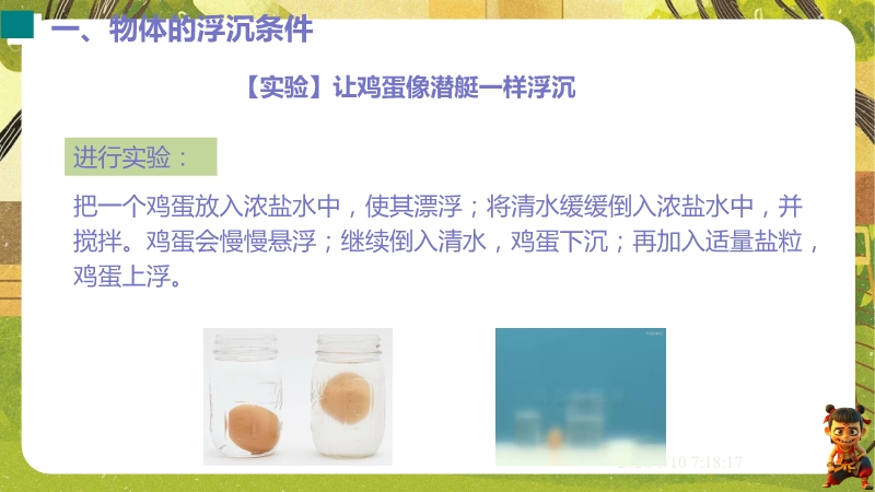 【内容简介】课件聚焦“物体的浮沉”,通过“听话的小瓶”魔术和鸡蛋在盐水里的浮沉实验导入,引导学生观察现象,分析受力,逐步总结出浮沉条件(浮力与重力、液体与物体密度关系),构建从实验到原理的学习支架。其亮点在于以科学探究为核心,结合鸡蛋浮沉实验、潜水艇等生活应用实例,通过表格梳理浮沉条件,培养学生科学思维和物理观念。分层练习题(基础题、中考题)助力巩固,课堂小结系统归纳,既帮助学生提升探究能力和知识应用能力,也为教师提供完整教学资源,提高教学效率。