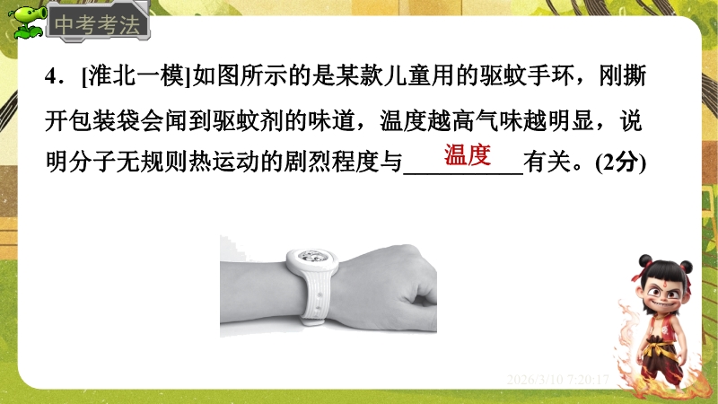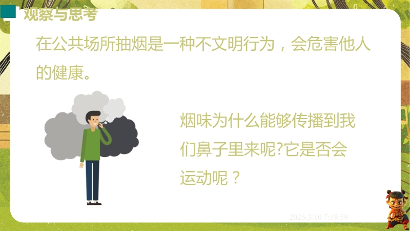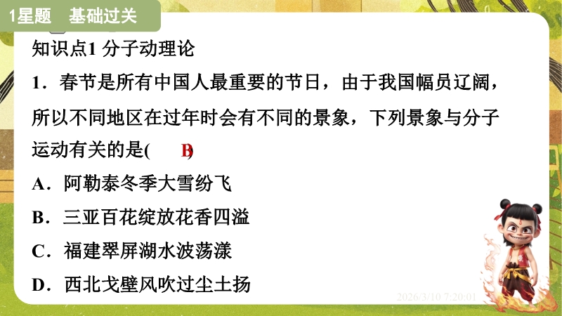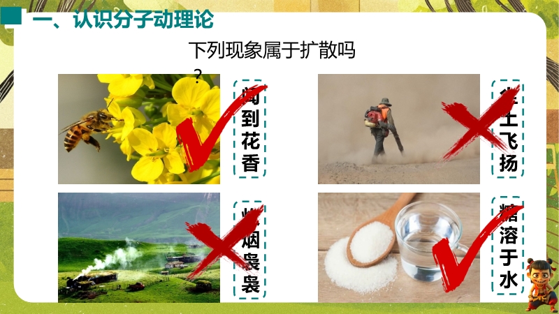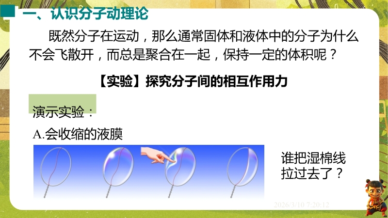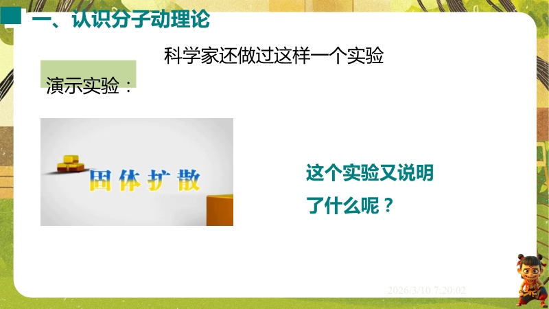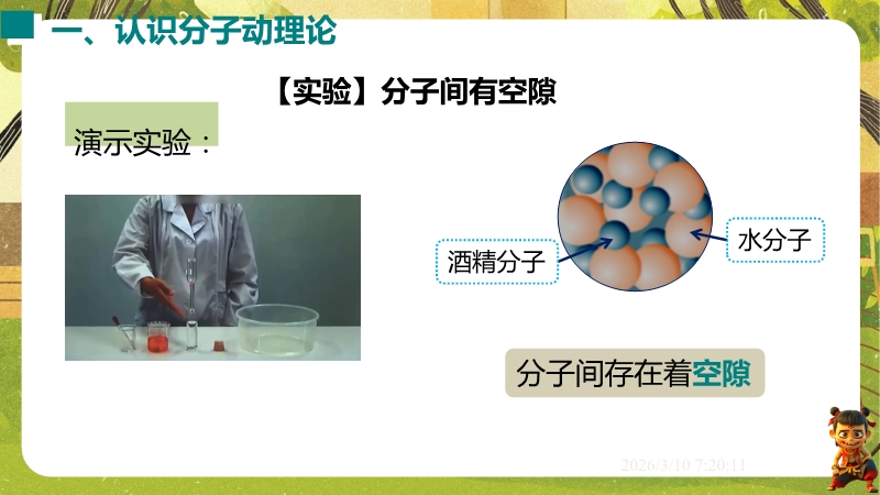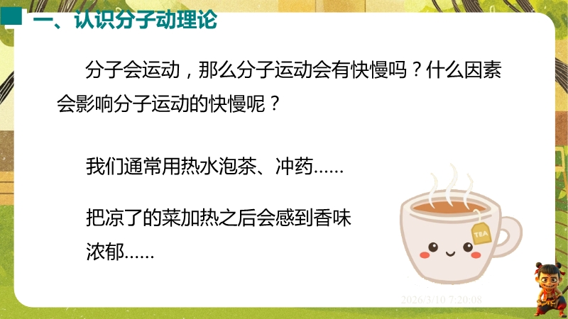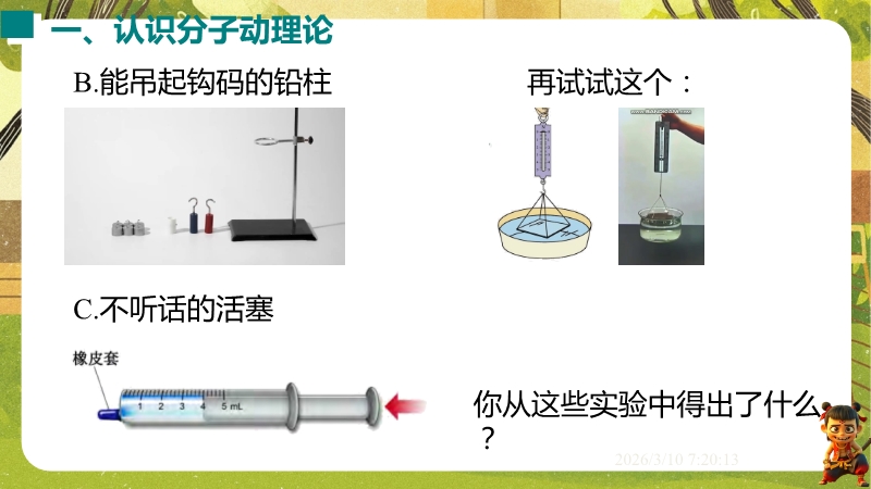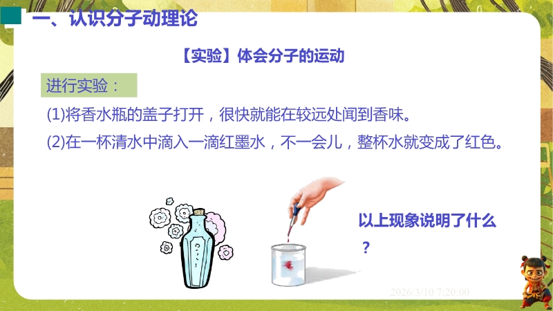 【内容简介】课件聚焦“分子动理论的初步知识”,通过“烟味传播”情境导入,结合香水瓶扩散、红墨水混合等实验,引导学生从生活现象到科学概念,构建分子运动、间隙、作用力及三态分子差异的知识脉络。其亮点在于以实验探究为核心,通过温度影响分子运动实验、铅柱吊钩码等演示,渗透物理观念与科学探究素养,辅以1星基础题和2星情境应用题,帮助学生具象理解抽象概念,教师可借此提升教学互动性与知识落实效率。