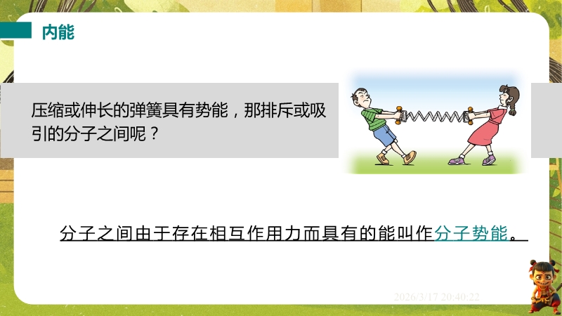 【内容简介】课件聚焦物体的内能及其变化,涵盖内能的概念、单位、影响因素,热量的定义,以及改变内能的热传递和做功两种方式。通过暖水瓶瓶塞弹起等生活现象导入,结合足球动能类比分子动能、弹簧势能类比分子势能,构建从定义到影响因素再到改变方式的学习支架,辅以实例分析和练习题巩固。其亮点在于以科学探究为核心,通过空气压缩引火仪、水蒸气冲橡皮塞等实验,结合“烤火与搓手”等生活实例,引导学生理解能量转化与转移。利用温度、热量、内能对比表格培养科学思维,结构化知识点总结强化物理观念。既帮助学生深化概念理解,又为教师提供丰富教学资源,提升课堂效率。