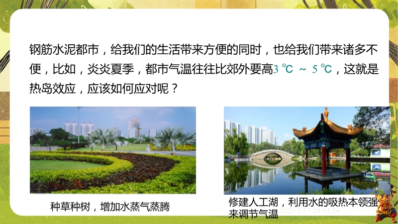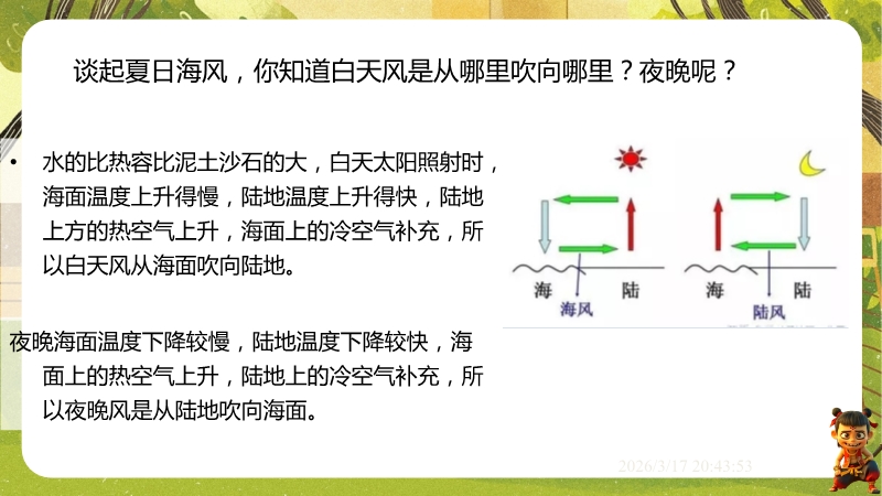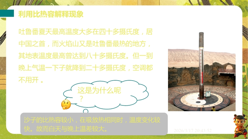 【内容简介】课件聚焦比热容的计算与应用,通过吐鲁番昼夜温差、海陆风、热岛效应等自然现象导入,引导学生从生活实例出发,理解水的比热容特性,进而掌握吸热放热公式,构建“现象—原理—计算”的知识支架。其亮点在于以物理观念为核心,结合科学思维与社会责任,通过实例分析(如解释海陆风成因)培养学生用比热容知识解决实际问题的能力,通过规范例题与分层练习强化科学推理。内容结构清晰,帮助学生深化能量观念,教师可直接用于课堂教学,提升效率。