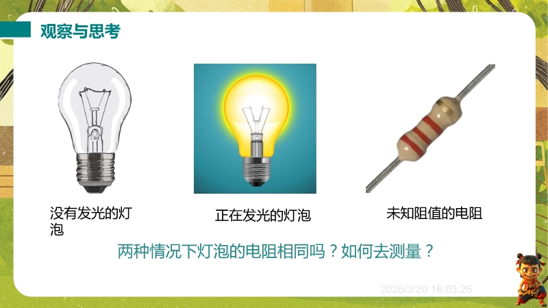 【内容简介】课件聚焦“测量导体的电阻”,以伏安法为核心,通过“观察与思考”对比发光与不发光灯泡电阻差异导入,衔接欧姆定律,搭建从已知到未知的学习支架,系统呈现定值电阻与小灯泡电阻的测量方法。其亮点在于以科学探究为主线,通过设计实验、分析数据(如对比定值电阻与小灯泡测量表格差异)培养科学思维,结合伏阻法、等效替代法等特殊测量方法渗透质疑创新,助力学生构建物理观念,教师可借助清晰结构与分层练习提升教学效率。