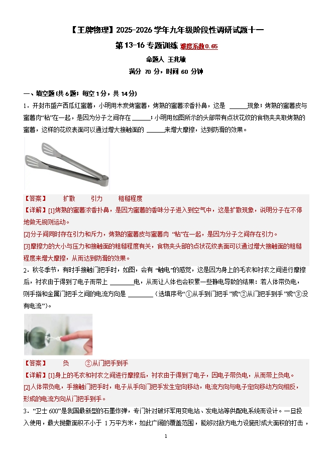 【内容简介】第13-16章 专题训练--2025-2026学年人教版九年级阶段性调研试题十一(原卷版和解析版)【王牌物理】