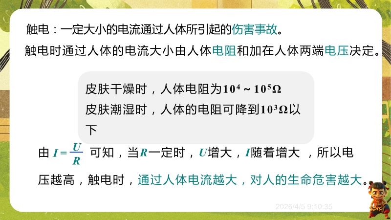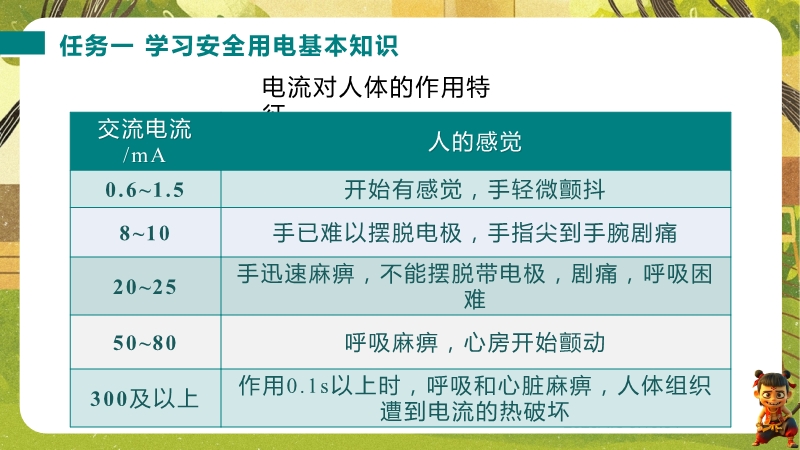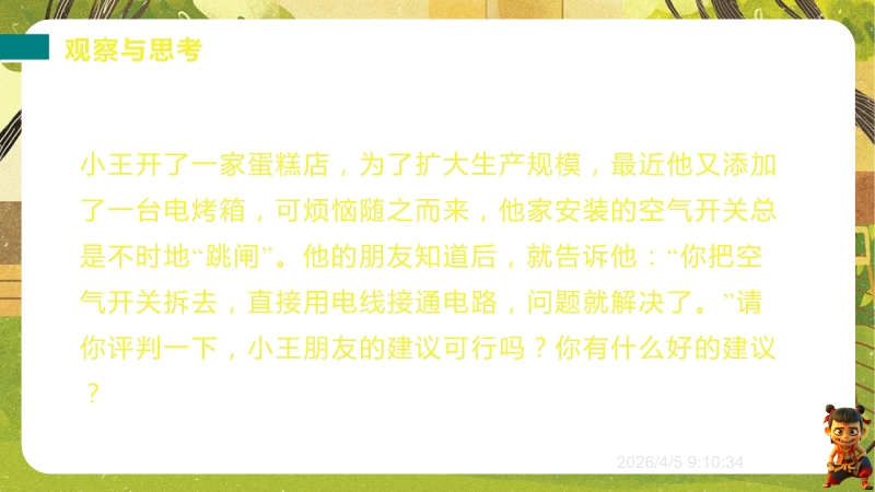 【内容简介】课件聚焦安全用电,涵盖电流对人体的作用、触电类型、安全电压、家庭用电常识及试电笔使用等核心内容。以“空气开关跳闸是否拆除”的生活情境导入,引导学生从实际问题出发,逐步构建安全用电知识体系,形成从现象到原理再到应用的学习支架。其亮点在于通过数据表格(电流对人体作用)、正误对比(试电笔使用)及实践作业(制作科普海报、模拟电路演示),培养科学思维与科学探究能力。强调安全用电“四不”原则和应急措施,渗透科学态度与责任,帮助学生将理论转化为安全行为,也为教师提供丰富教学资源,提升课堂实效。